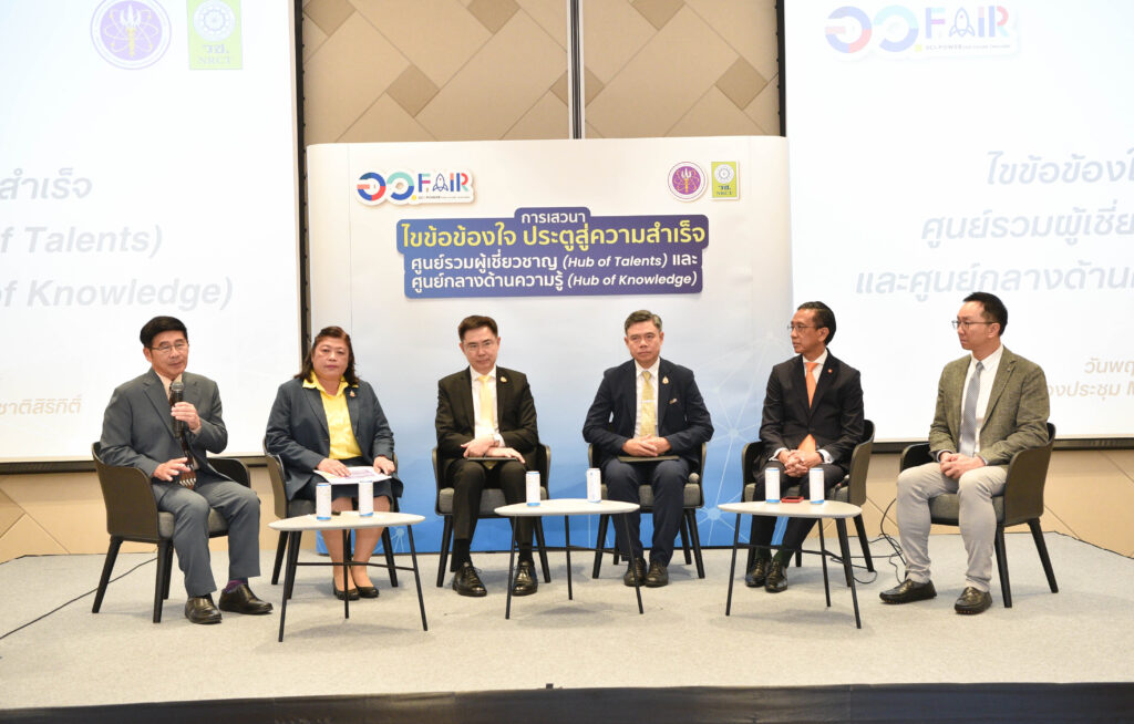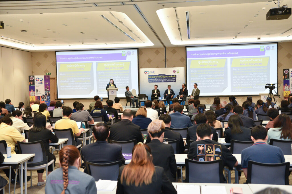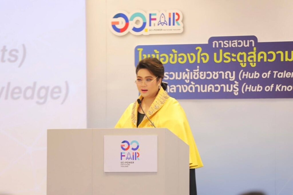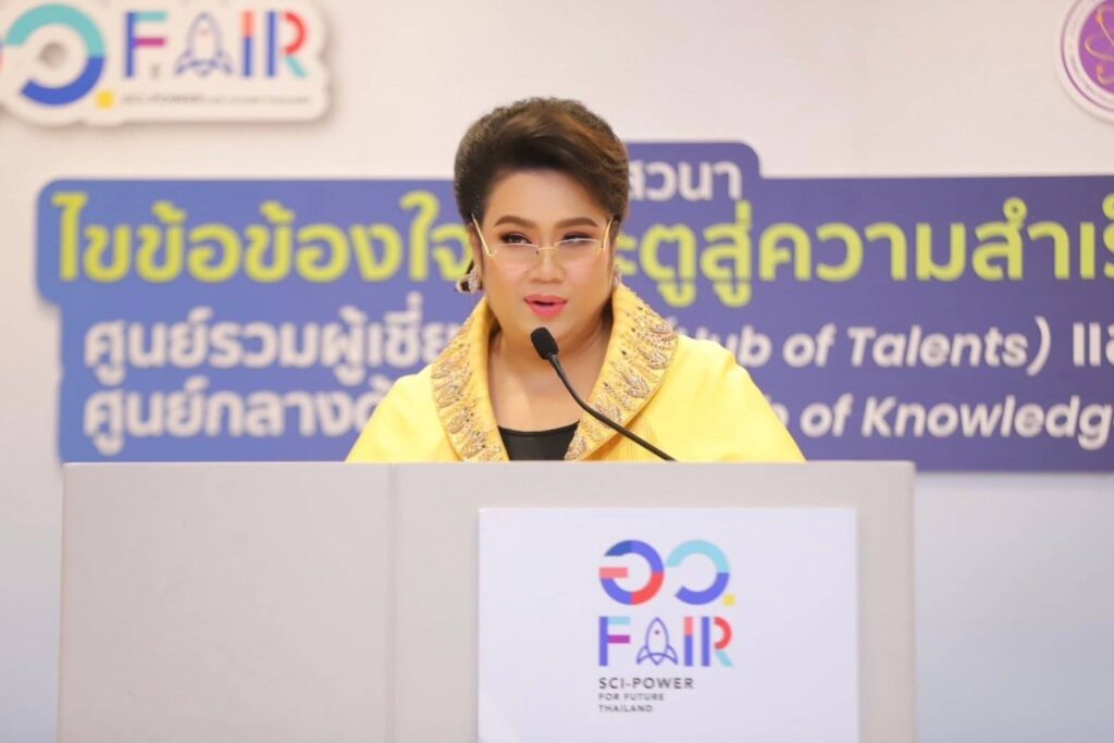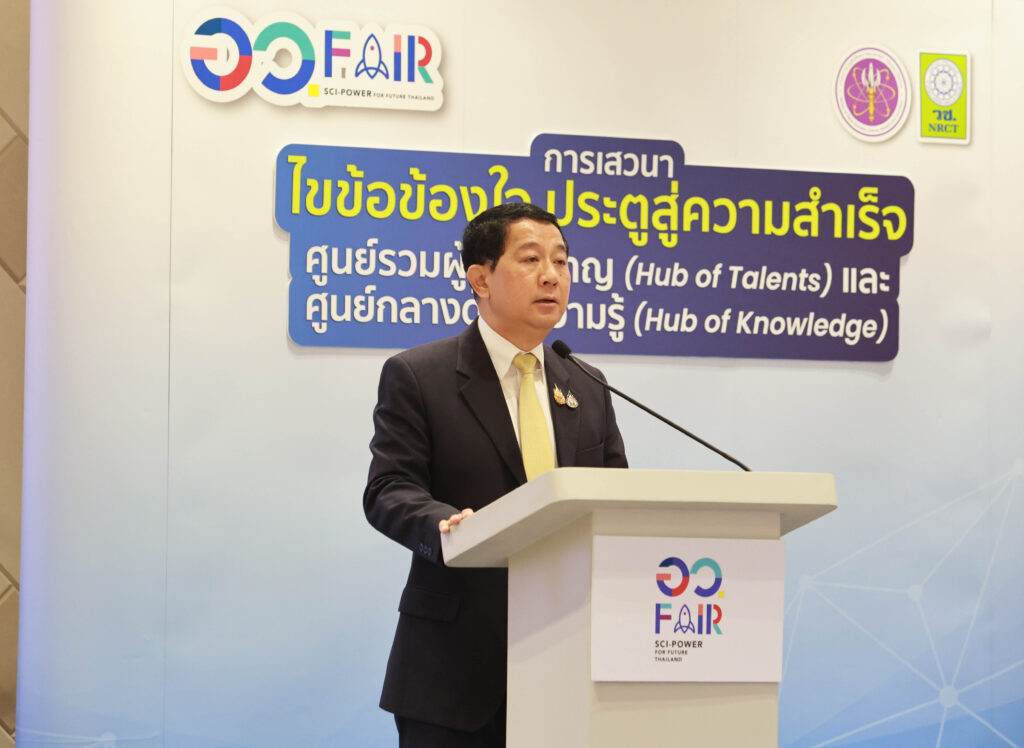 วันที่ 25 กรกฎาคม 2567 นางสาวศุภมาส อิศรภักดี รมว.การอุดมศึกษา วิทยาศาสตร์ วิจัยและนวัตกรรม เป็นประธานเปิดการเสวนาเรื่อง “ไขข้อข้องใจ ประตูสู่ความสำเร็จศูนย์รวมผู้เชี่ยวชาญ (Hub of Talents) และศูนย์กลางด้านความรู้ (Hub of Knowledge)” โดยมี ศ.เกียรติคุณ ดร.นพ.สิริฤกษ์ ทรงศิวิไล ประธานคณะกรรมการส่งเสริมวิทยาศาสตร์ วิจัยและนวัตกรรม ปาฐกถาพิเศษเรื่อง “นโยบายด้านวิทยาศาสตร์ วิจัยและนวัตกรรมเพื่อการพัฒนากำลังคนด้านวิทยาศาสตร์ วิจัยและนวัตกรรม” ศ.กิตติคุณ นพ.สุทธิพร จิตต์มิตรภาพ ประธานคณะทำงานที่ปรึกษาเพื่อการพัฒนาศูนย์รวมผู้เชี่ยวชาญ (Hub of Talents) และศูนย์กลางด้านความรู้ (Hub of Knowledge) ดร.วิภารัตน์ ดีอ่อง ผู้อำนวยการสำนักงานการวิจัยแห่งชาติ และผู้ทรงคุณวุฒิ ร่วมเสวนา เรื่อง “ไขข้อข้องใจ ประตูสู่ความสำเร็จ ศูนย์รวมผู้เชี่ยวชาญ (Hub of Talents) และศูนย์กลางด้านความรู้ (Hub of Knowledge)” พร้อมด้วย ผู้บริหาร นักวิจัย แขกผู้มีเกียรติและสื่อมวลชน เข้าร่วมรับฟังการเสวนาดังกล่าว ซึ่งจัดขึ้นภายในงาน อว.แฟร์ : SCI POWER FOR FUTURE THAILAND มหกรรมส่งเสริมการใช้ประโยชน์ อววน. เพื่อการพัฒนาเศรษฐกิจไทยอย่างยั่งยืน ด้วยพลังสหวิทยาการ ณ ห้องประชุม MR209 ศูนย์การประชุมแห่งชาติสิริกิติ์