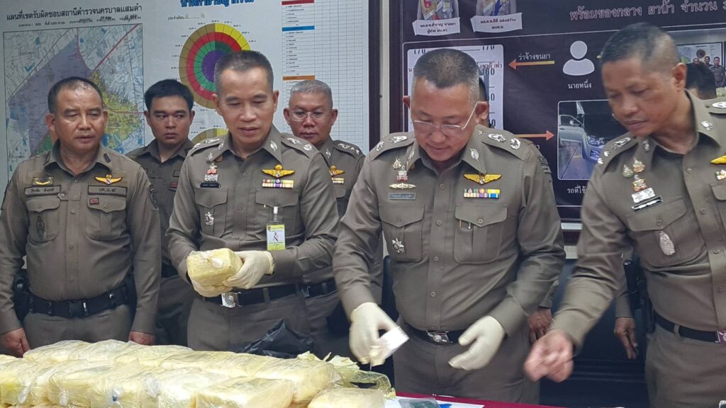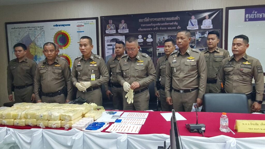 เมื่อเวลา 16.30 น.วันที่ 26 ก.ค.ที่ สน.แสมดำ พล.ต.ต.ชรินทร์ โกพัฒน์ตา รอง ผบช.น.พร้อมด้วย พล.ต.ต.ประสงค์ อานมณี ผบก.น.9, พ.ต.อ.เศกสิทธิ์ สุภาอ้วน, พ.ต.อ.ธีระชัย เด็ดขาด รอง ผบก.น.9 และ พ.ต.อ.ปรีชา หนูสลุง ผกก.สน.แสมดำ แถลงผลงานสายตรวจ สน.แสมดำ จับกุมตัว นายธิติวุฒิ หรือปาย เจริญตรีเพ็ชร์ อายุ 22 ปี ชาว จ.พระนครศรีอยุธยา พร้อมของกลางยาบ้า 30 ห่อ ปั๊มตราบรรจุภัณฑ์ “999” สีน้ำเงิน รวม 300,000 เม็ด รถกระบะยี่ห้ออีซูซุ รุ่นดีแม็กซ์ สีบรอนซ์เงิน ทะเบียน 3 ฒน 3535 กรุงเทพมหานคร โดยจับกุมตัวได้ที่ ปั๊มน้ำมันเชลล์ สาขานำรุ่งเรือง ถนนพระราม 2 ขาออก แขวงแสมดำ เขตบางขุนเทียน กทม.