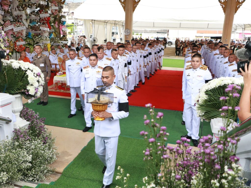 ต่อมาเวลา 14.00 น. ครอบครัวของผู้เสียชีวิตพร้อม เจ้าพนักงานกองพิธีการศพ กระทรวงวัฒนธรรม ได้นำหีบทองลายสลักขึ้นราชรถก่อนวนรอบเมรุ 3 รอบ โดยบรรยากาศเต็มไปด้วยความโศกเศร้าของคนที่เข้าร่วมพิธี นอกจากนี้ยังมีการแสดงโขนเรื่องรามเกียรติ์จากกรมศิลปากรเพื่อประกอบในพิธีอีกด้วย