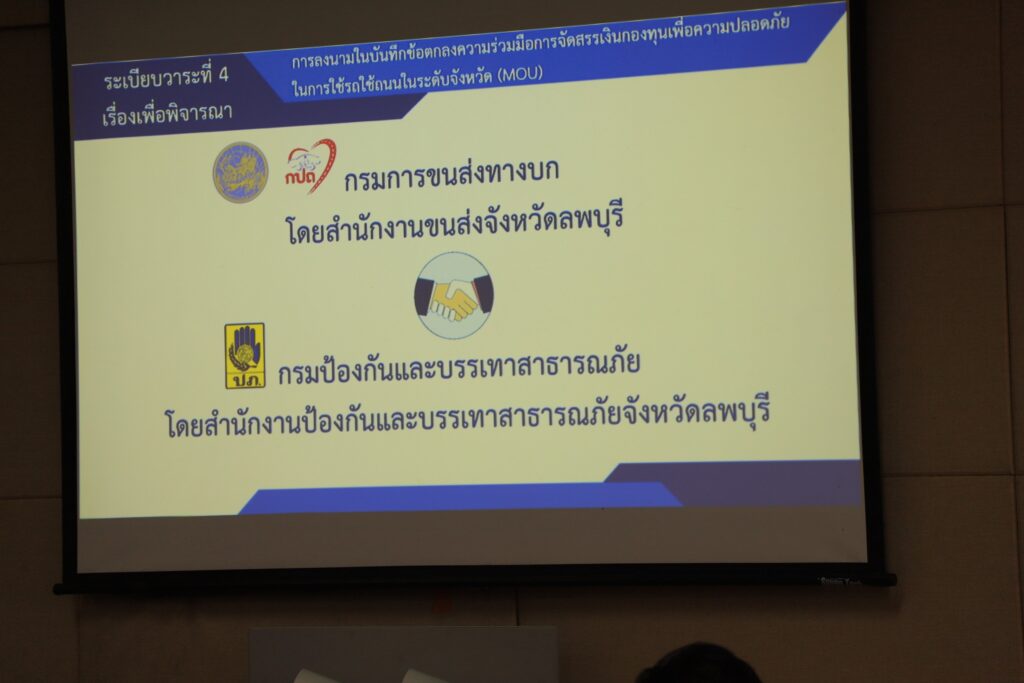 สำหรับการประชุมในครั้งนี้ที่ประชุมได้รับทราบที่คณะอนุกรรมการมีมติอนุมัติจัดสรรเงินสำหรับดำเนินโครงการ จำนวน 2โครงการ ประกอบด้วย โครงการเสริมสร้างความรู้ผู้ปกครองร่วมใจลดปัญหาอุบัติเหตุ ทางถนนจากรถจักรยานยนต์ จังหวัดลพบุรี จำนวนเงิน 77,400 บาท และโครงการพัฒนาผู้นำท้องที่ต้นแบบสร้างความปลอดภัยในการใช้รถใช้ถนนจากรถจักรยานยนต์ จำนวนเงิน 560,500 บาท จากนั้นได้ทำพิธีบันทึกข้อตกลงความร่วมมือการจัดสรรเงินกองทุนเพื่อความปลอดภัยในการใช้รถใช้ถนนสำหรับดำเนินโครงการด้านความปลอดภัยทางถนนในระดับจังหวัดระหว่างกรมการขนส่งทางบก โดย สำนักงานขนส่งจังหวัดลพบุรีและกรมป้องกันและบรรเทาสาธารณภัย โดย สำนักงานป้องกันและบรรเทาสาธารณภัยจังหวัดลพบุรีจำนวน 2 โครงการดังกล่าว เพื่อร่วมกันขับเคลื่อนโครงการด้านความปลอดภัยทางถนนในระดับจังหวัด ในการป้องกันการเกิดอุบัติเหตุและลดอัตราการเสียชีวิต และส่งเสริมสนับสนุนการดำเนินงานด้านการป้องกันและลดการเกิดอุบัติเหตุและลดอัตราการเสียชีวิต ให้สำเร็จตามเป้าหมายแผนปฏิบัติการกองทุนเพื่อความปลอดภัยในการใช้รถใช้ถนนต่อไป