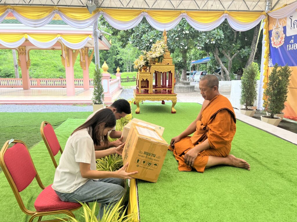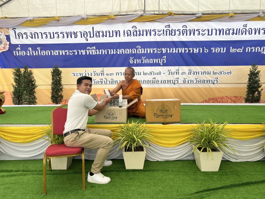 สำนักงานพัฒนาชุมชนจังหวัดลพบุรี โดย นางบัณฑิตา หมื่นพรม พัฒนาการจังหวัดลพบุรี ร่วมกับ ผู้ประกอบการโอทอปจังหวัดลพบุรี บริษัท หนุมานออร์แกนิคฟาร์ม จำกัด โดย นางสาว พรลาวัณย์ ภู่พานิชเจริญ ถวายผลิตภัณฑ์สุขภาพ แด่พระสงฆ์ในโครงการบรรพชาอุปสมบท เฉลิมพระเกียรติพระบาทสมเด็จพระเจ้าอยู่หัว เนื่องในโอกาสพระราชพิธีมหามงคลเฉลิมพระชนมพรรษา 6 รอบ 28 กรกฎาคม 2567 ประกอบด้วย ฟุตแพทซ์ 30 ห่อ สติ๊กเกอร์ไล่หวัด 30 กล่อง และยาสีฟันสมุนไพร 100 หลอด เพื่อสนับสนุนโครงการฯ