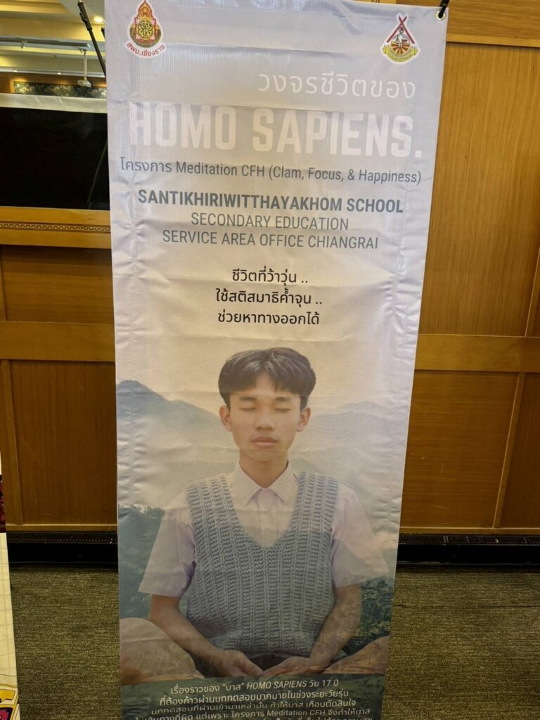 sapiens” โดยโรงเรียนสันติคีรีวิทยาคม สังกัด สพม.เชียงราย ทั้ง 3 ระดับ ได้รับโล่พร้อมเงินรางวัลทุนการศึกษา จำนวน 20,000 บาท และผลการตัดสินรางวัลชมเชย ทั้งสิ้น จำนวน 9 รางวัล ได้แก่ ชื่อผลงาน “ใช้สมอง นั่งสมาธิ (ใช้หมอง นั่งมาธิ)” “ใจเย็นได้ด้วยสมาธิ” “สตินำทาง” “ไอ แฮฟ สติ” “พอใจ” “Meditation “วัยว้าวุ่น”” “หลักตอ” “The relax ปลด ปล่อย วาง” “Second “วินาที””