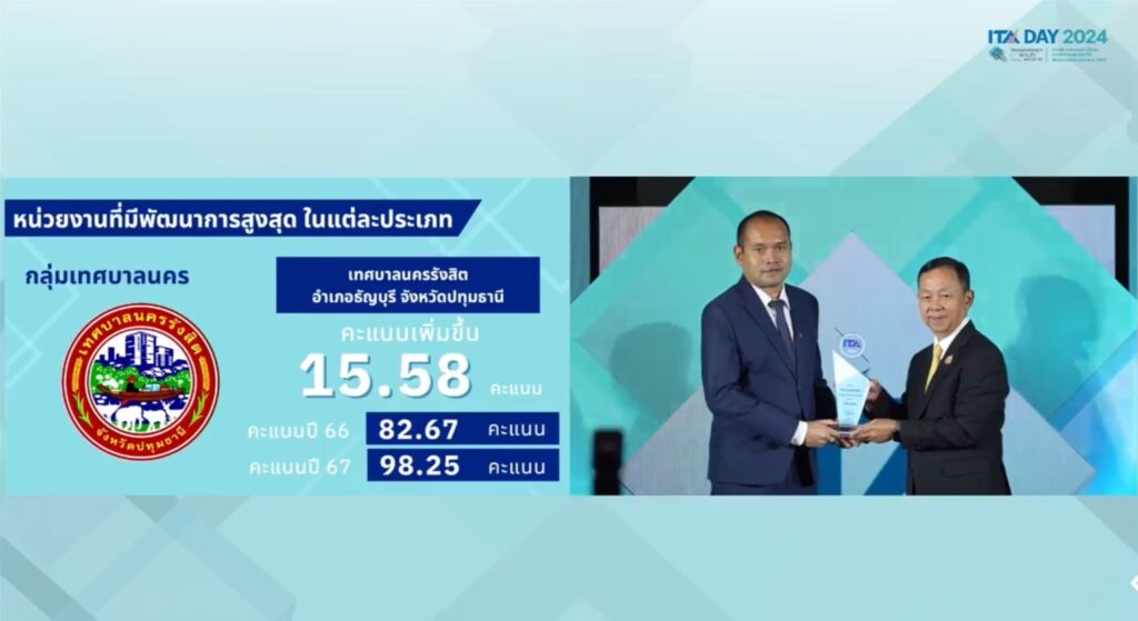 สำหรับ เทศบาลนครรังสิต โดย ร้อยตำรวจเอก ดร.ตรีลุพธ์ ธูปกระจ่าง นายกเทศมนตรีนครรังสิต เข้ารับรางวัลโล่เกียรติยศ ITA Awards สำหรับหน่วยงานที่มีพัฒนาการสูงสุด ประเภทเทศบาลนคร ประจำปีงบประมาณ พ.ศ. 2567 คะแนนเฉลี่ย 98.25 คะแนน โดย พลตำรวจเอกวัชรพล ประสารราชกิจ ประธานกรรมการ ป.ป.ช. เป็นผู้มอบรางวัล ทั้งนี้ นายณรงค์ชัย รัตติมาสกล รองนายกเทศมนตรีนครรังสิต พร้อมด้วย นายไชยวัฒ มีคุณ ปลัดเทศบาล นางสาวกมลรัตน์ สมเคราะห์ หัวหน้าฝ่ายป้องกันและบรรเทาสาธารณภัย สำนักปลัดเทศบาล และนางสาวบุญญฤทธิ์ ภู่ระย้า หัวหน้าฝ่ายยุทธศาสตร์และแผนงาน กองยุทธศาสตร์และงบประมาณ เข้าร่วมงานฯ ดังกล่าว