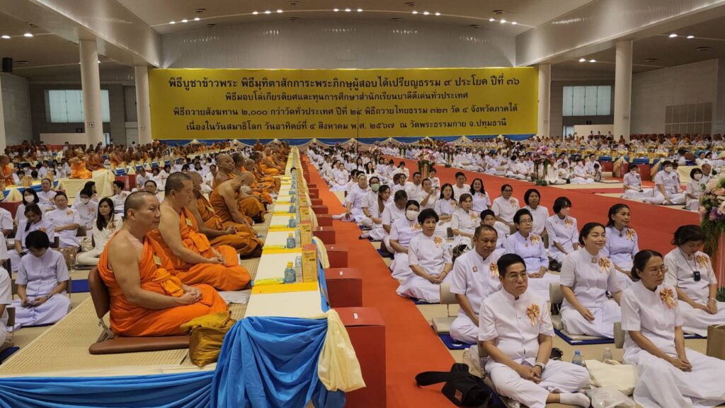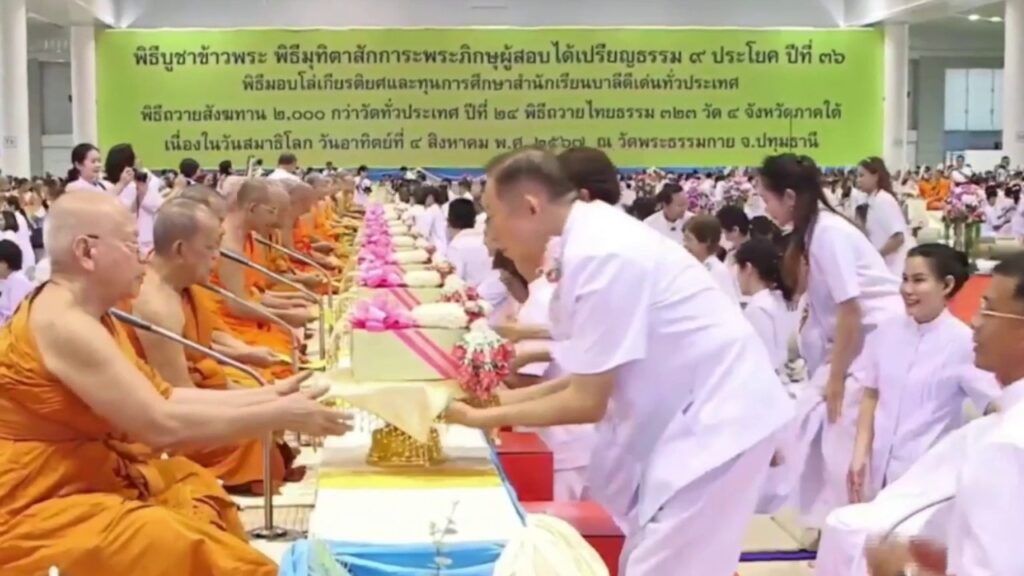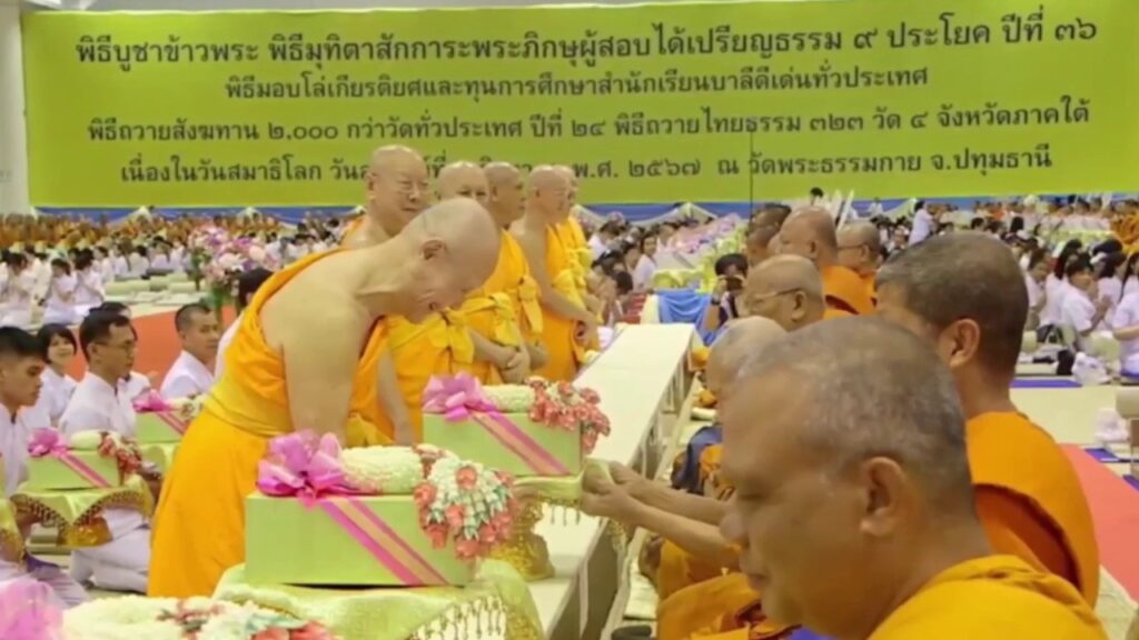 วันที่ 4 สิงหาคม 2567 ที่วัดพระธรรมกาย ตำบลคลองสาม อำเภอคลองหลวง จังหวัดปทุมธานี พุทธศาสนิกชนร่วมมุทิตาสักการะพระภิกษุผู้สอบได้เปรียญธรรม 9 ประโยค ปีที่ 36 มอบโล่เกียรติยศ , มอบทุน และอุปกรณ์การเรียนสำนักเรียนบาลีดีเด่น รวมมูลค่า 2 ล้านบาท พร้อมถวายสังฆทานคณะสงฆ์ 2,000 วัด – 323 วัด 4 จ.ชายแดนภาคใต้