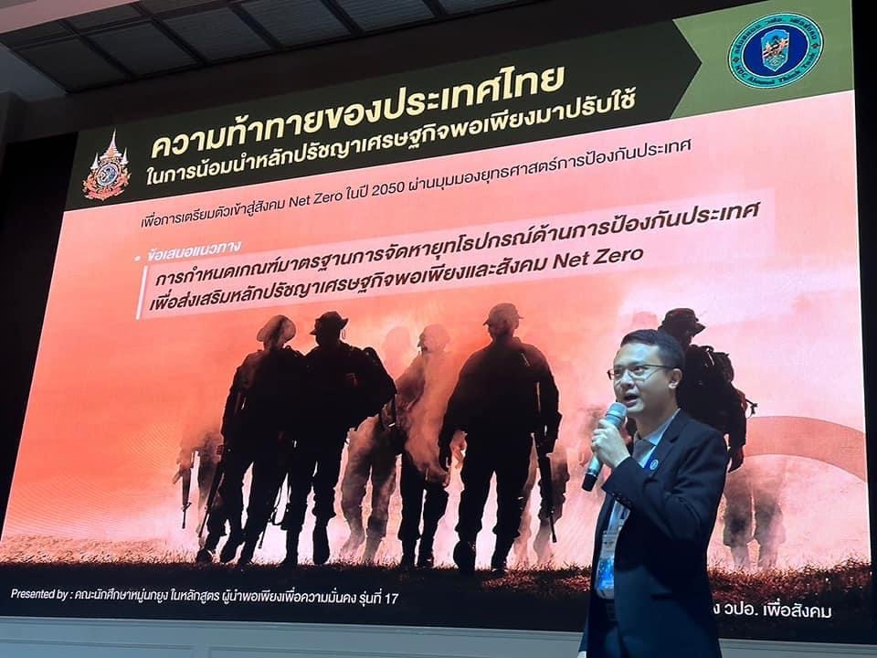อีกทั้งในวันที่ 1 สิงหาคม 2567 ได้มีการแถลงผลงานทางวิชาการของผู้เข้ารับการอบรมหลักสูตรผู้นำพอเพียงเพื่อความมั่นคง รุ่นที่ 17 (นพม.17) ซึ่งประกอบไปด้วยกรอบวิชาการ 6 กลุ่ม คลังสมอง วปอ. เพื่อสังคม จากประเด็น “ความท้าทายของประเทศไทยในการใช้หลักปรัชญาของเศรษฐกิจพอเพียงเพื่อเข้าสู่สังคม Net Zero ในปี 2050” โดยครอบคลุมทุกด้านของยุทธศาสตร์ความมั่นคง คือ ด้านการเมือง ด้านเศรษฐกิจ ด้านวิทยาศาสตร์ ด้านสังคมจิตวิทยา ด้านการป้องกันประเทศ และด้านยุทธศาสตร์ ณ ห้องประชุมใหญ่ อาคาร Convention Hall ศูนย์ศึกษายุทธศาสตร์กองทัพไทยฯ แหลมแท่น จ.ชลบุรี