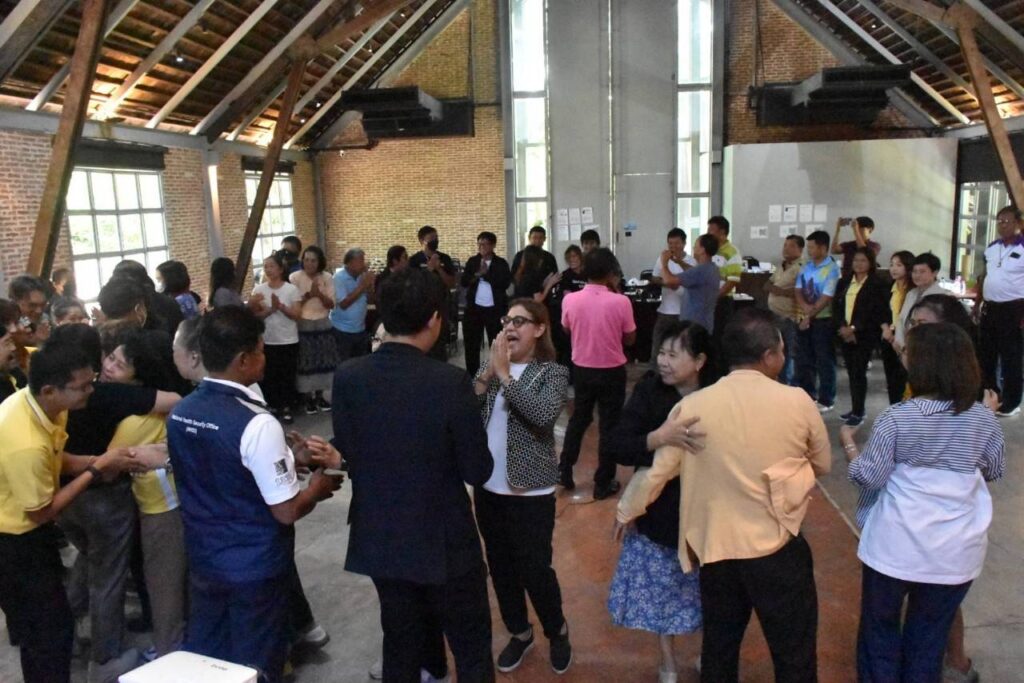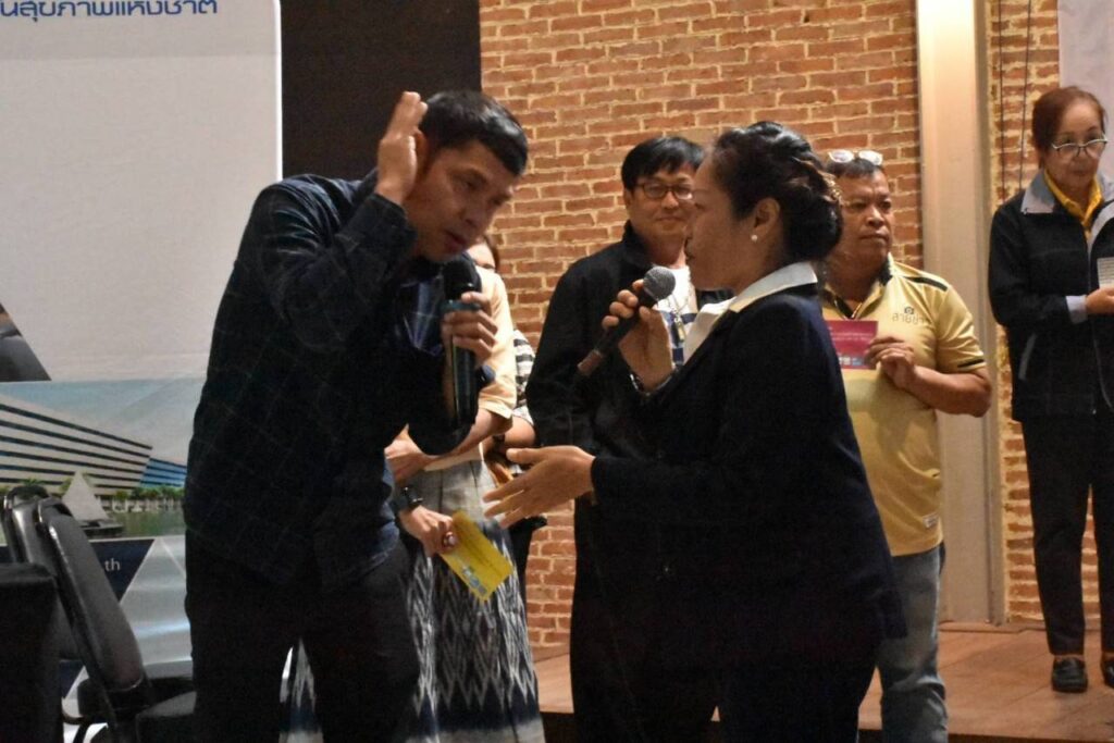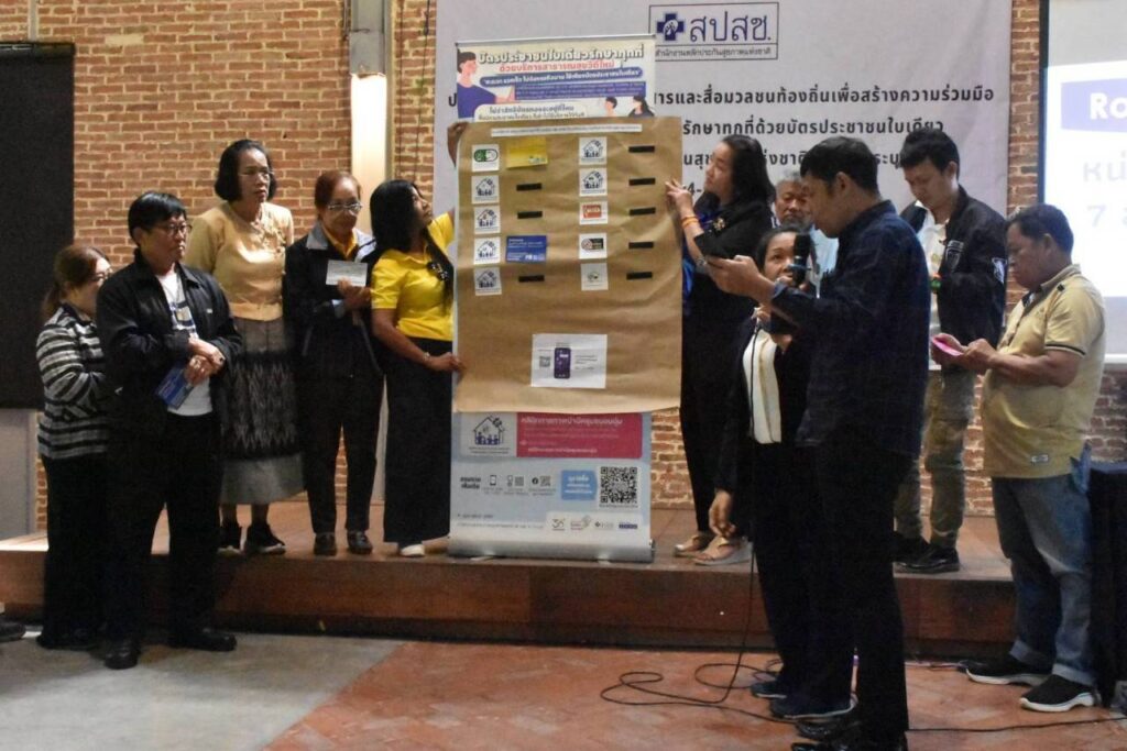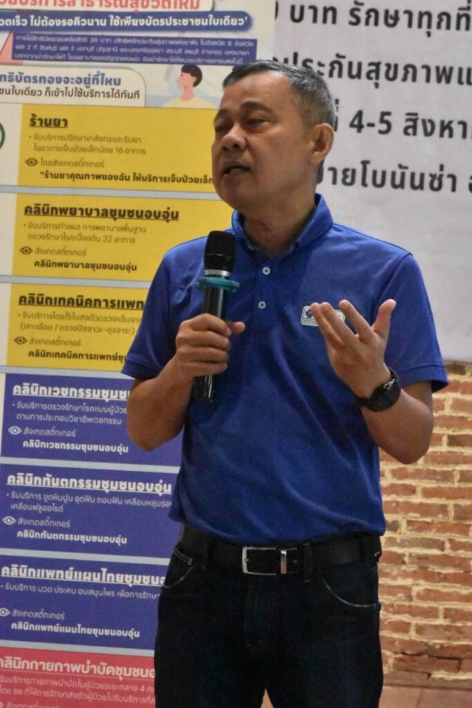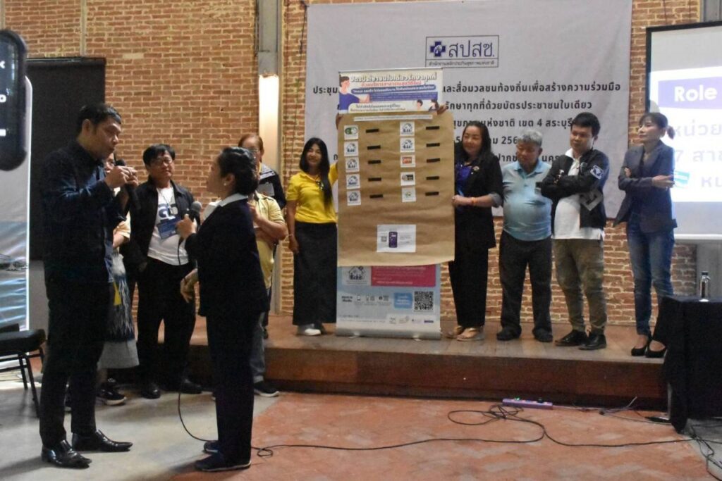 บรรยากาศภายในการจัดอบรมประกอบด้วยการบรรยายและแรลลี่ “รอบรู้สิทธิบัตรทองและนโยบาย 30บาทรักษาทุกที่ด้วยบัตรประชาชนใบเดียว” จำนวน 4 ฐาน ได้แก่ ฐาน 1. สิทธิประโยชน์ในระบบหลักประกันสุขภาพ ฐาน 2. การคุ้มครองสิทธิในระบบหลักประกันสุขภาพ ฐาน 3. การลงทะเบียนสิทธิ การเปลี่ยนหน่วยบริการ และฐาน 4. หน่วยบริการนวัตกรรม 7 สาขา และการค้นหาหน่วยนวตกรรม จากนั้นสรุปการเรียนรู้รายกลุ่มด้วยกิจกรรม Role play และกระบวนการค้นหาตัวเองโดยตั้งเป้าหมายเพื่อทำงานสื่อสารประชาสัมพันธ์สิทธิบัตรทองอย่างต่อเนื่องร่วมกับเครือข่ายในพื้นที่ และยังได้รับเกียรติจาก CEO นพกฤษฏิ์ นิธิเลิศวิจิตร ประธานเจ้าหน้าที่บริหารบริษัท ซัคเซสมอร์ บีอิ้งค์ จำกัด (มหาชน) ทอล์คโชว์ “ชีวิตพลังบวก” เพื่อปลุกพลังแนวคิดสร้างสรรค์งานสื่อสารหลักประกันสุขภาพแห่งชาติและสานสัมพันธ์นักสื่อสาร UC
