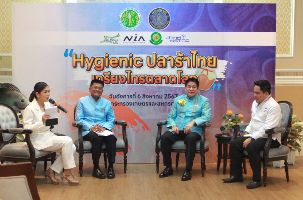 วันอังคารที่ 6 สิงหาคม 2567 ณ ห้องประชุม 115 กระทรวงเกษตรและสหกรณ์ กรุงเทพฯ : กระทรวงเกษตรและสหกรณ์ กรมประมง ภาครัฐ และเอกชน ร่วมแถลงข่าวในหัวข้อ “ปลาหมอคางดำ ทำอย่างไรให้เป็นปลาร้า Hygienic” ภายในงาน “Hygienic ปลาร้าไทย เกรียงไกรตลาดโลก” แชร์เทคนิคการแปรรูปปลาหมอคางดำเป็นน้ำปลาร้าแบบถูกสุขลักษณะ พร้อมนำเสนอ 5 เมนูสุดพิเศษจากปลาหมอคางดำที่ปรุงคู่กับปลาร้าไทยมาให้ผู้เข้าร่วมงานชม และชิม นอกจากนี้ ยังมีการจัดนิทรรศการแสดงผลิตภัณฑ์จากก้างปลาหมอคางดำตอบโจทย์การใช้ประโยชน์จากเศษเหลือทิ้ง และเมนูอาหารจากปลาหมอคางดำมากมาย รวมถึงบูทผลิตภัณฑ์จากปลาร้า เพื่อเป็นไอเดียหนุนภาคประชาชนมีส่วนร่วมในการควบคุมและกำจัดปลาหมอคางดำเพื่อการบริโภคเพิ่มขึ้น