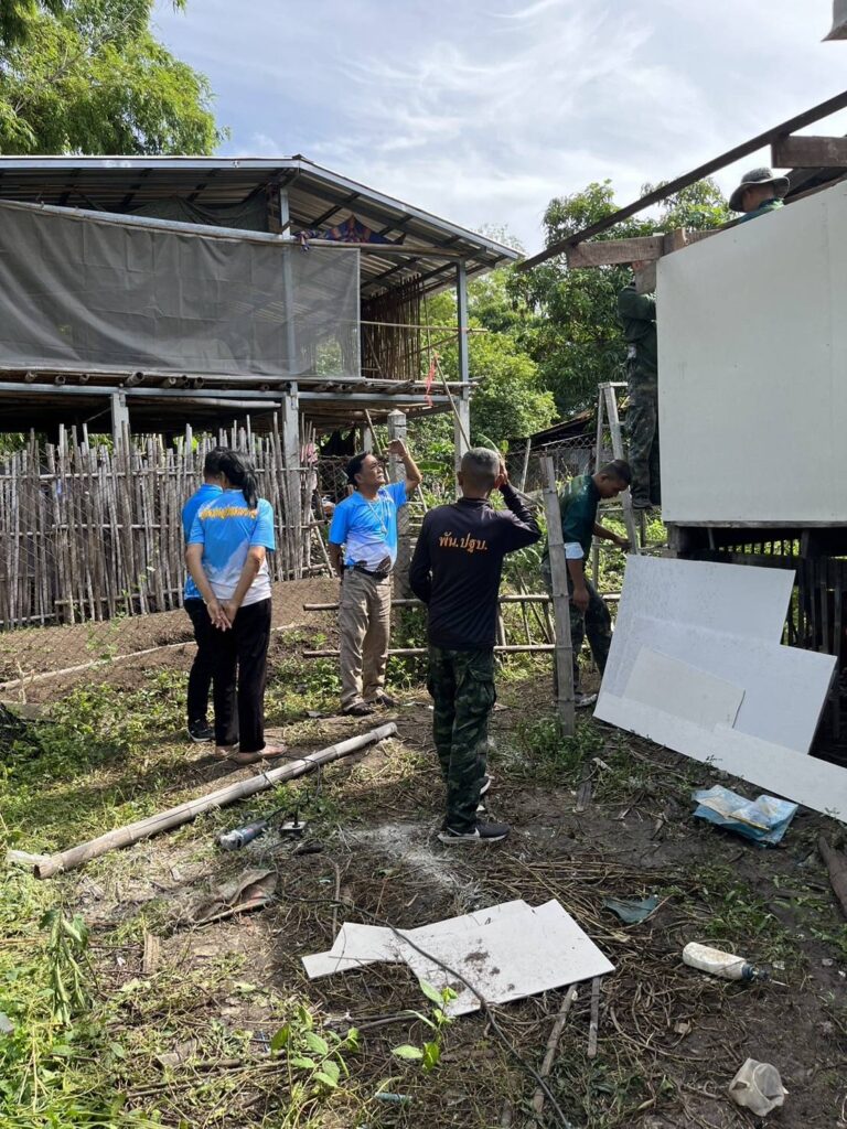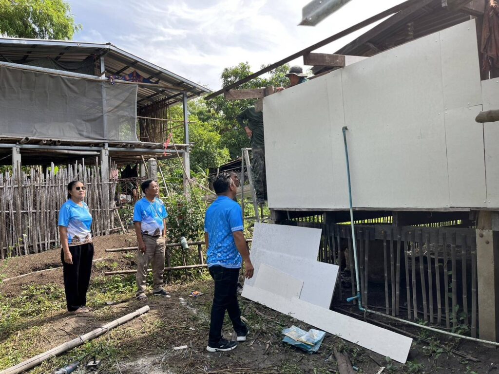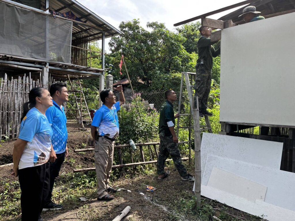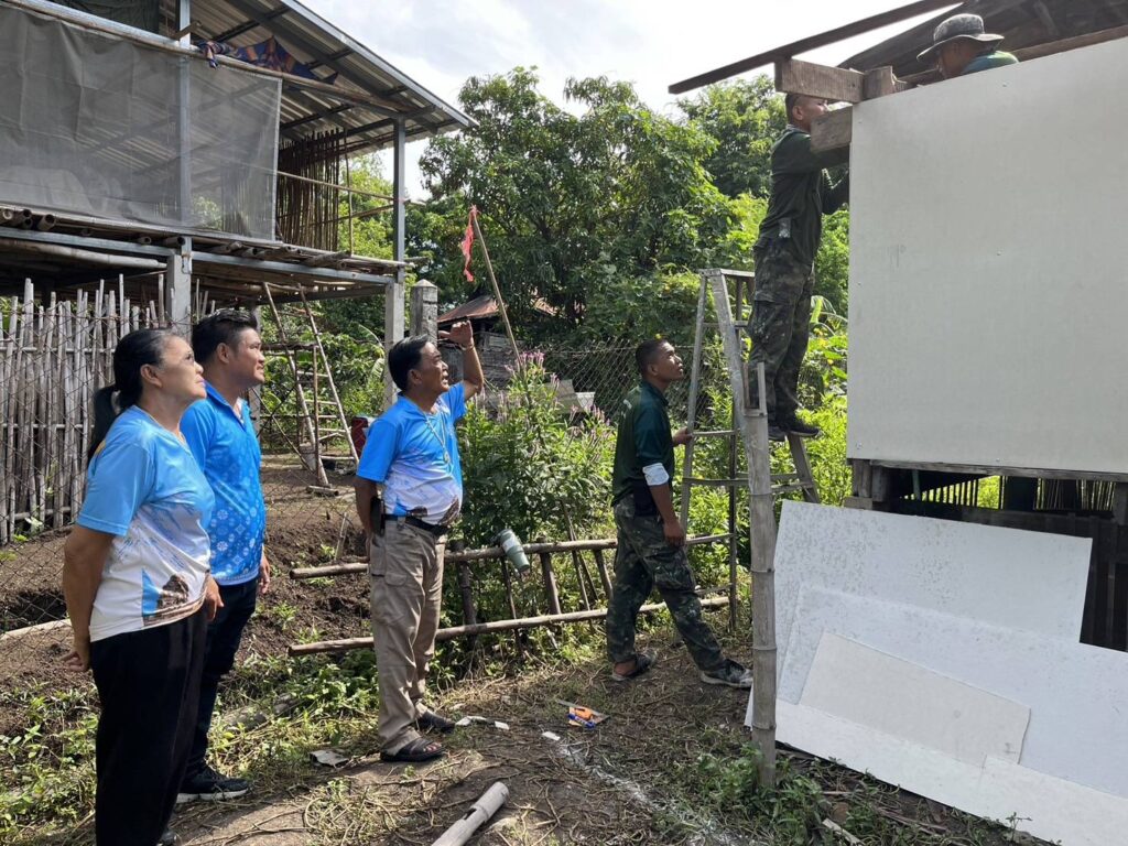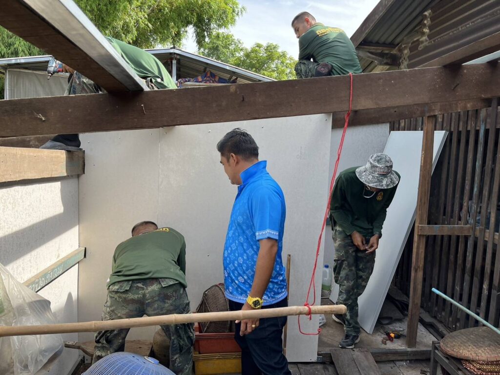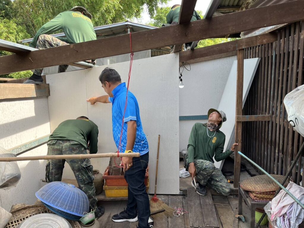 ได้นำทีมงานช่าง อบต. หนองทรายขาว และกำลังพลทหาร พัน.ปฐบ.ศบบ. เพื่อทำการลงพื้นที่ซ่อมแซมบ้านพักอาศัยดังนี้