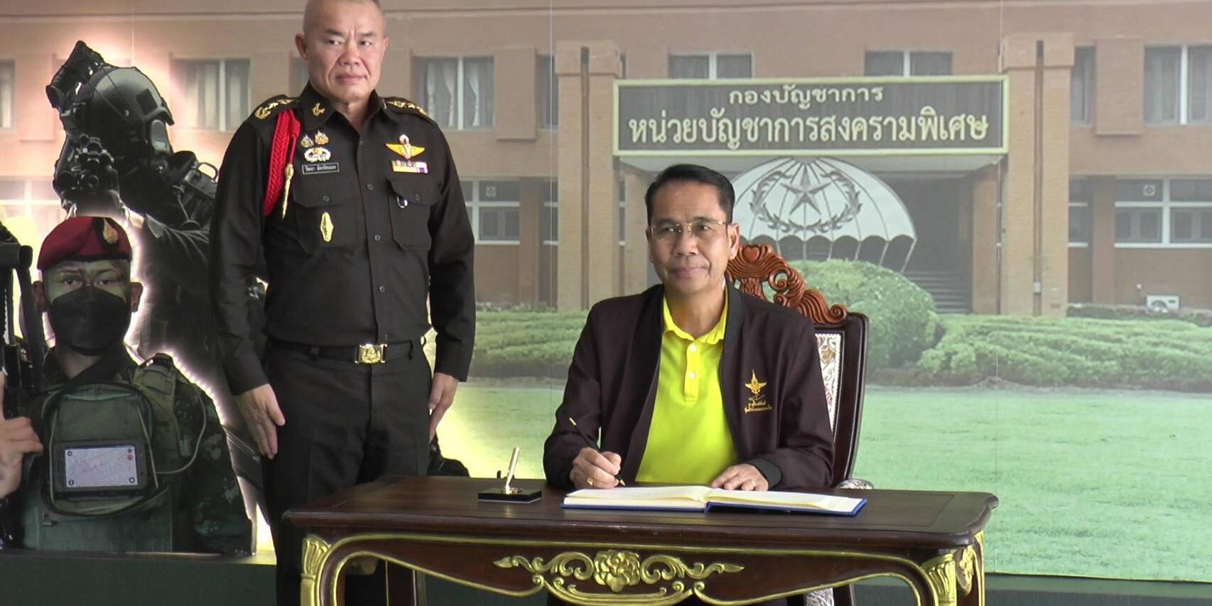 จากนั้น…รัฐมนตรีว่าการกระทรวงกลาโหม พร้อมคณะได้เดินทางต่อไปยัง กองบัญชาการหน่วยบัญชาการสงครามพิเศษ ค่ายสมเด็จพระนายรายณ์มหาราช จ.ลพบุรี โดยมี พลโท วัฒนา ฉัตรรัตนแสง ผู้บัญชาการหน่วยบัญชาการสงครามพิเศษ ให้การต้อนรับ โดยเมื่อเดินทาง ถึง รัฐมนตรีว่าการกระทรวงกลาโหม พร้อมคณะ ได้เข้าสักการะพระบรมราชานุสาวรีย์ สมเด็จพระนารายณ์มหาราช ลงนามในสมุดตรวจเยี่ยม พร้อมเข้ารับฟังการบรรยายสรุป เกี่ยวกับภารกิจ ของหน่วยรบพิเศษ ในการปฏิบัติงานทั้งในที่ตั้ง และการปฏิบัติการภาคสนาม พร้อมทั้งร่วมหารือ ให้ข้อเสนอแนะ กล่าวให้โอวาท และมอบแนวทางในการทำงาน ให้แก่ผู้บังคับหน่วยขึ้นตรงทหารรบพิเศษในพื้นที่จังหวัดลพบุรี พร้อมทั้งนำ คณะฯ รวมรับชมการสาธิต การปฏิบัติการรบพิเศษในรูปแบบต่างๆ ในแบบ STATIC DISPLAY บริเวณด้านหน้า หน้า กองบัญชาการหน่วยบัญชาการสงครามพิเศษ อาทิ การปฏิบัติของชุดปฏิบัติการพิเศษ , ชุดจู่โจม ,การปฏิบัติการทางน้ำ , การส่งกำลังทางอากาศ , การปฏิบัติงานด้านการติดต่อสื่อสาร , การปฏิบัติงานด้านการปฏิบัติการจิตวิทยา.. ซึ่งรัฐมนตรีว่าการกระทรวงกลาโหม ได้ชื่นชมขีดความสามารถของกำลังพล นักรบพิเศษ ซึ่งถือว่า.. แต่ละคนมีความสามารถที่หลากหลาย มีความอ่อนตัว และสามารถปฏิบัติงานได้ทุกรูปแบบในทุกๆ สถานการณ์ และมีการพัฒนาอย่างต่อเนื่อง สมกับคำขวัญของ หน่วยรบพิเศษ ที่ว่า… “พลังเงียบ เฉียบขาด”