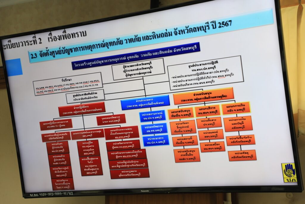 โดยที่ประชุมได้รับทราบถึงคำสั่งกองอนวยการป้องกันและบรรเทาสาธารณภัย ในเรื่องการจัดตั้งศูนย์บัญชาการเหตุการณ์อุทกภัย วาตภัย และดินถล่ม จังหวัดลพบุรี ประจำปี 2567 พร้อมทั้งได้รับทราบการคาดหมายลักษณะอากาศและสภาวะฝน สถานการณ์การบริหารจัดการน้ำในพื้นที่ นอกจากนี้ยังได้รับทราบถึงแผนงานและโครงการจากหน่วยงานต่าง ๆ ในการป้องกันและแก้ไขปัญหาอุทกภัย วาตภัยและดินถล่มในด้านต่าง ๆ ประกอบไปด้วย ด้านการป้องกันและบรรเทาสาธารณภัย ด้านเกษตร ด้านถนน/และโครงสร้าง ด้านแหล่งน้ำ