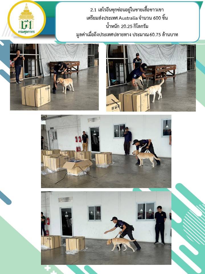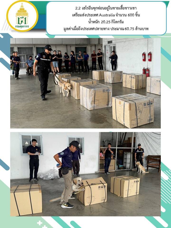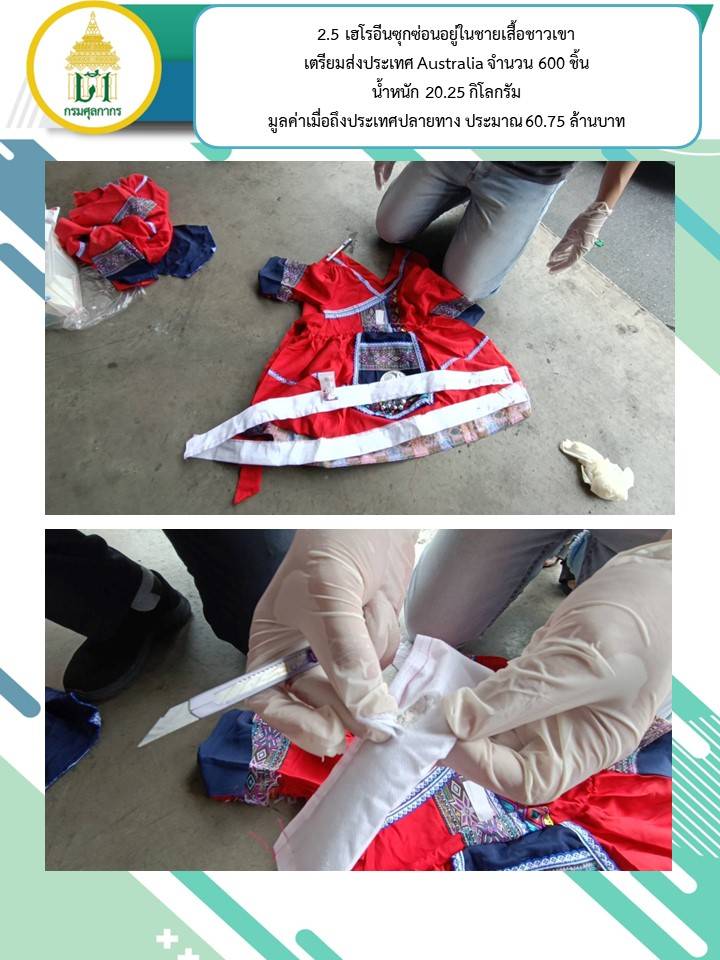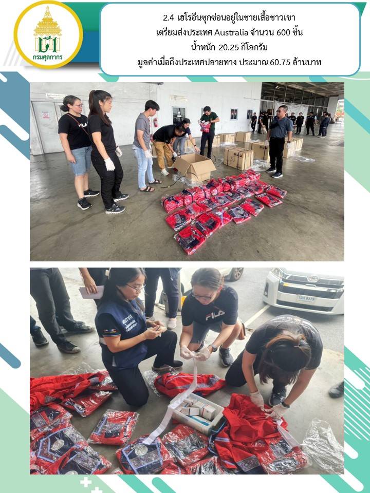 ต่อมาเมื่อวันที่ 8 สิงหาคม 2567 ได้ทำการวิเคราะห์ใบขนสินค้าขาออกที่มีความเสี่ยงลักลอบส่งออกยาเสพติดทางท่าเรือกรุงเทพ ปลายทางประเทศ Australia จึงทำการตรวจสอบด้วยเครื่องเอกซเรย์และสุนัขดมกลิ่นของกรมศุลกากร (K-9) พบเฮโรอีนซุกซ่อนอยู่ในชายเสื้อชาวเขา จำนวน 600 ชิ้น น้ำหนัก 20.25 กิโลกรัม มูลค่าประมาณ 60.75 ล้านบาท