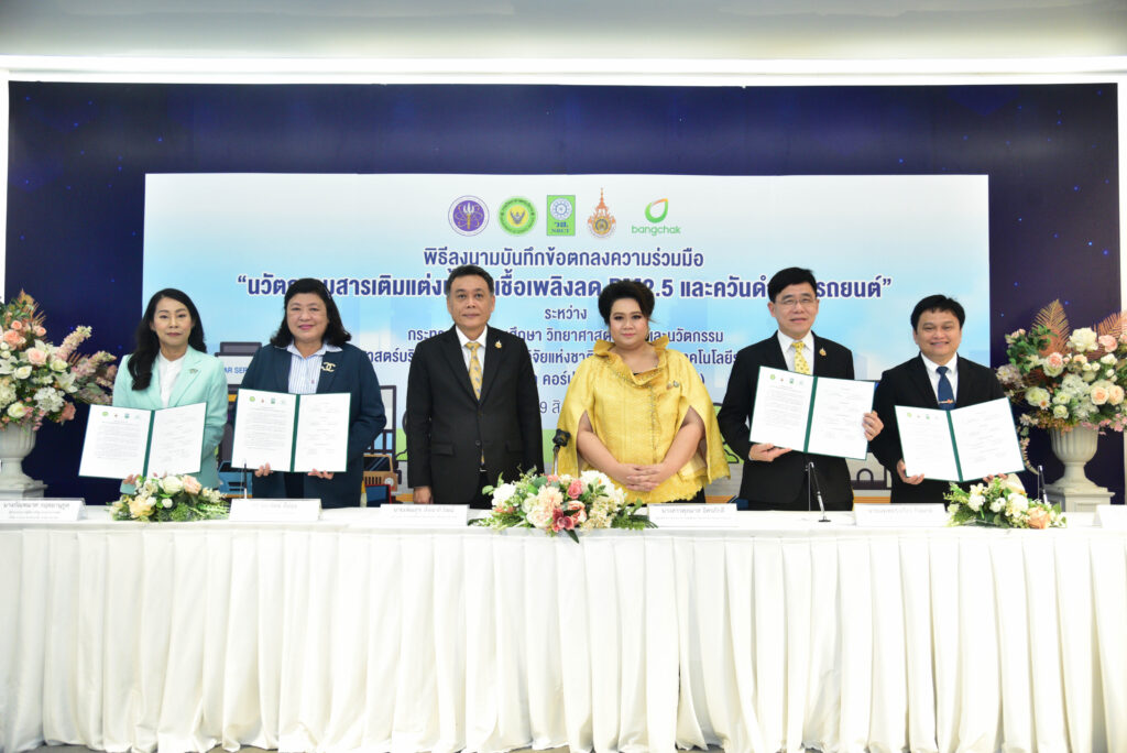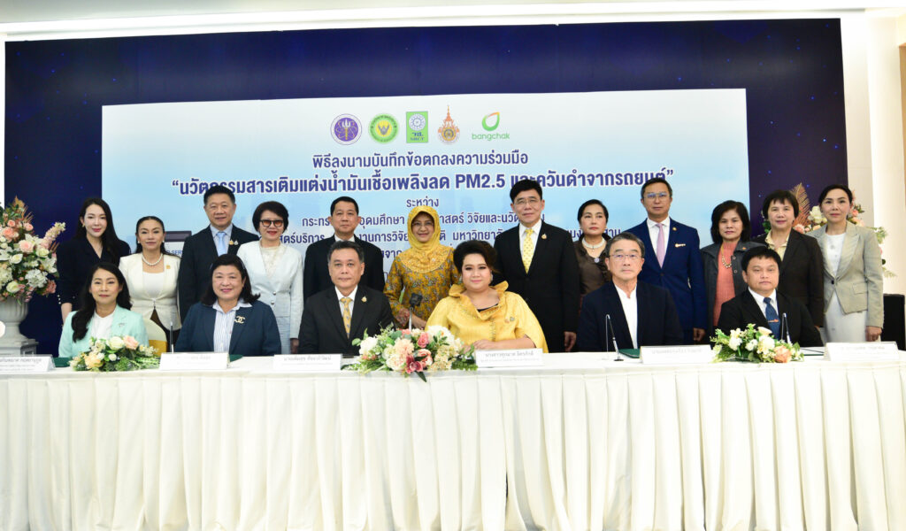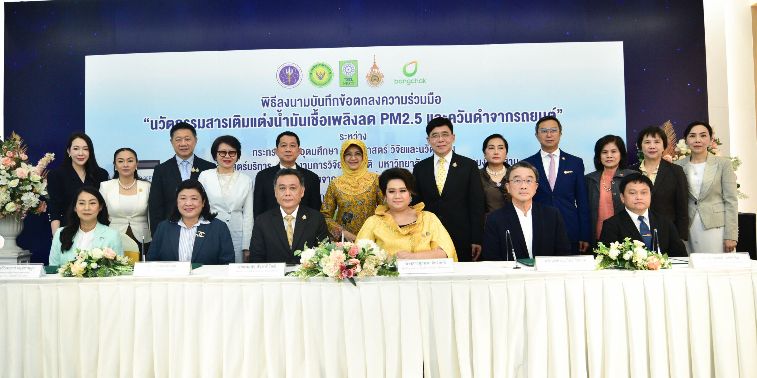 กระทรวงการอุดมศึกษา วิทยาศาสตร์ วิจัยและนวัตกรรม โดย สำนักงานการวิจัยแห่งชาติ (วช.) และกรมวิทยาศาสตร์บริการ ร่วมลงนามบันทึกข้อตกลงความร่วมมือ “การลดควันดำและ PM2.5 ของเครื่องยนต์ดีเซลด้วยสารเติมแต่งน้ำมันเชื้อเพลิง” พร้อมด้วย มหาวิทยาลัยเทคโนโลยีราชมงคลอีสาน และบริษัท บางจาก คอร์ปอเรชั่น จำกัด (มหาชน) เพื่อร่วมกันสนับสนุนการวิจัย และพัฒนานวัตกรรมเพื่อแก้ไขปัญหาฝุ่นพิษ PM2.5 ซึ่งเป็นวิกฤตเรื้อรังของประเทศไทยมาต่อเนื่องและยาวนาน และส่งผลกระทบต่อระบบทางเดินหายใจของคนไทย โดยมี นางสาวศุภมาส อิศรภักดี รัฐมนตรีว่าการกระทรวงการอุดมศึกษา วิทยาศาสตร์ วิจัยและนวัตกรรม เป็นประธานในพิธีลงนามบันทึกข้อตกลงความร่วมมือฯ นายเพิ่มสุข สัจจาภิวัฒน์ ปลัดกระทรวงการอุดมศึกษา วิทยาศาสตร์ วิจัยและนวัตกรรม พ.ญ.เพชรดาว โต๊ะมีนา ที่ปรึกษารัฐมนตรีว่าการกระทรวงการอุดมศึกษา วิทยาศาสตร์ วิจัยและนวัตกรรม และ ศ.นพ.ดร.สิริฤกษ์ ทรงศิวิไล ประธานกรรมการส่งเสริมวิทยาศาสตร์ วิจัยและนวัตกรรม เข้าร่วมพิธี และมี ดร.วิภารัตน์ ดีอ่อง ผู้อำนวยการ วช. นายแพทย์รุ่งเรือง กิจผาติ อธิบดีกรมวิทยาศาสตร์บริการ รศ.ดร.บัณฑิต กฤตาคม รองอธิการบดีฝ่ายวิจัย พัฒนานวัตกรรมและบริการวิชาการ มหาวิทยาลัยเทคโนโลยีราชมงคลอีสาน และคุณกัณฑมาศ กฤตยานุกูล ผู้ช่วยกรรมการผู้จัดการใหญ่ สายงานการผลิต บริษัทบางจาก คอร์ปอเรชั่น จำกัด (มหาชน) ร่วมลงนามในครั้งนี้ ณ กระทรวง อว.