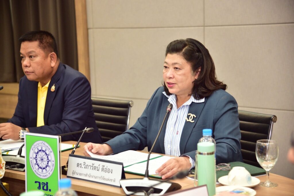 ดร.วิภารัตน์ ดีอ่อง ผู้อำนวยการสำนักงานการวิจัยแห่งชาติ กล่าวว่า (วช.) ภายใต้กระทรวง (อว.) ในฐานะหน่วยบริหารจัดการทุนวิจัยและนวัตกรรมของประเทศ ทำหน้าที่ส่งเสริมและสนับสนุนการต่อยอดขยายผลงานวิจัยและนวัตกรรม และถ่ายทอดองค์ความรู้งานวิจัยและนวัตกรรม โดยเชื่อมโยงกับทุกภาคส่วนที่เกี่ยวข้อง โดยเฉพาะอย่างยิ่งด้านบริหารจัดการทรัพยากรน้ำร่วมกับกรมชลประทาน เพื่อขับเคลื่อนและขยายผลงานวิจัยสู่การใช้ประโยชน์ด้านบริหารจัดการทรัพยากรน้ำผ่านกลไกความร่วมมือระหว่างองค์กรผู้ใช้น้ำและภาคีหน่วยงานระดับท้องถิ่น จังหวัด ซึ่งเป็นการดำเนินงานต่อเนื่องจากแผนงานยุทธศาสตร์เป้าหมาย (Spearhead) ด้านสังคม ซึ่ง (วช.) ได้ให้การสนับสนุน โดยทุนเพื่อการนำผลงานวิจัยและนวัตกรรมไปใช้ประโยชน์ (Research Utilization: RU) ซึ่งมุ่งเน้นต่อยอดโครงการเพื่อให้เกิดการนำไปใช้ในระดับที่สูงขึ้น ซึ่งต้องการความร่วมมือในการขยายผลงานวิจัยจากกรมชลประทาน รวมถึงหน่วยงานเครือข่าย เช่น มหาวิทยาลัยที่เป็นต้นทาง ในการทำงานควบคู่กันเพื่อพัฒนาการใช้ประโยชน์ผลงานวิจัยและนวัตกรรมไปสู่การบูรณาการในทุกมิติ เช่น การวางแผนการใช้น้ำผ่านกลไกความร่วมมือในการบริหารจัดการน้ำในพื้นที่ เพื่อให้เกิดผลสำเร็จอย่างเป็นรูปธรรม