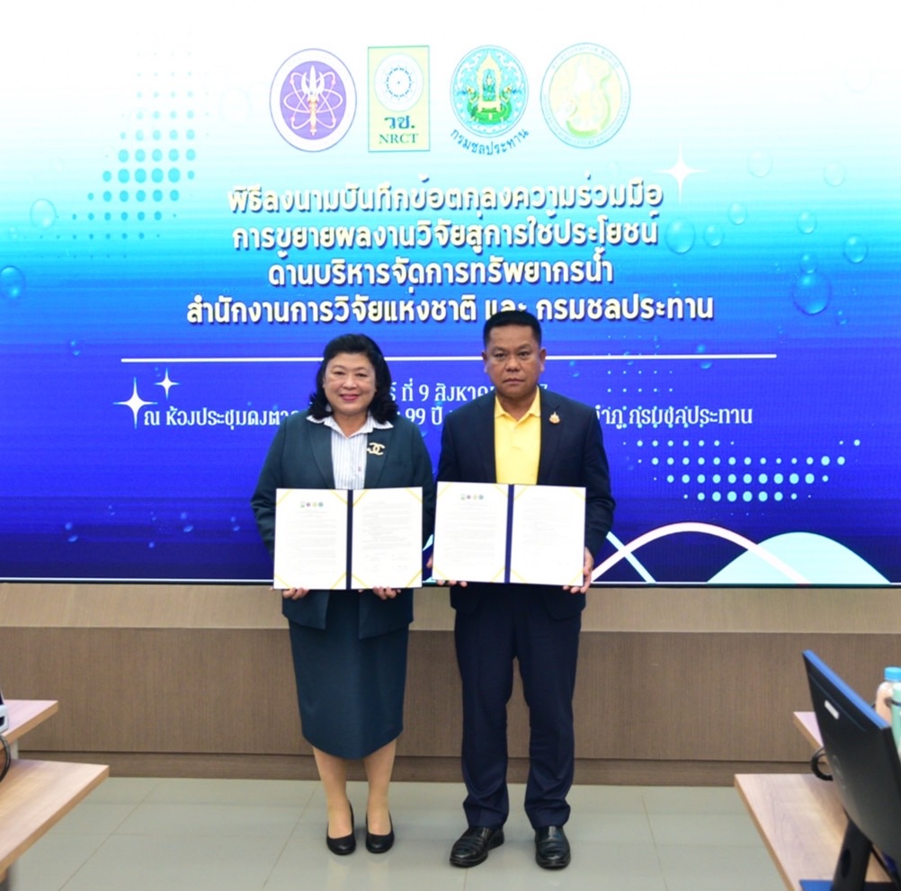 วันที่ 9 สิงหาคม 2567 สำนักงานการวิจัยแห่งชาติ (วช.) กระทรวงการอุดมศึกษา วิทยาศาสตร์ วิจัยและนวัตกรรม (อว.) โดย ดร.วิภารัตน์ ดีอ่อง ผู้อำนวยการสำนักงานการวิจัยแห่งชาติ พร้อมด้วย นายชูชาติ รักจิตร อธิบดีกรมชลประทาน ร่วมลงนามบันทึกข้อตกลงความร่วมมือ “การขยายผลงานวิจัยสู่การใช้ประโยชน์ด้านบริหารจัดการทรัพยากรน้ำ” เพื่อร่วมมือกันขับเคลื่อนและขยายผลงานวิจัยด้านการบริหารจัดการน้ำของประเทศ ณ ห้องประชุมดงตาล ชั้น 4 อาคาร 99 ปี หม่อมหลวงชูชาติ กำภู กรมชลประทาน