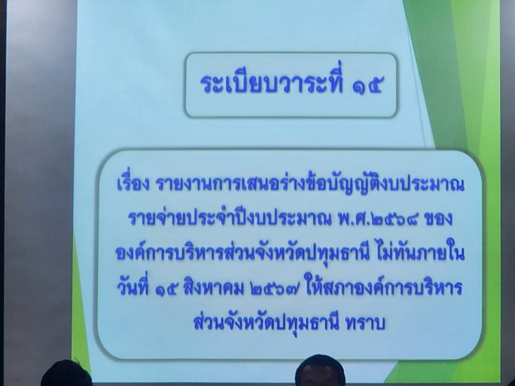สำหรับในที่ประชุมนายยุทธนา แสงพงศานนท์ ปลัดองค์การบริหารส่วนจังหวัดปทุมธานี รักษาราชการนายกองค์การบริหารส่วนจังหวัดปทุมธานีได้ชี้แจงเรื่อง รายงานการเสนอร่างข้อบัญญัติงบประมาณรายจ่ายประจำปีงบประมาณ พ.ศ.2568 ขององค์การบริหารส่วนจังหวัดปทุมธานี ไม่ทันภายในวันที่ 15 สิงหาคม 2567 ให้สภาองค์การบริหารส่วนจังหวัดปทุมธานีทราบ เนื่องจากต้องรอนายกองค์การบริหารส่วนจังหวัดปทุมธานีที่มาจากการเลือกตั้ง เพื่อกำหนดนโยบายให้เป็นไปตามที่หาเสียงต่อประชาชน