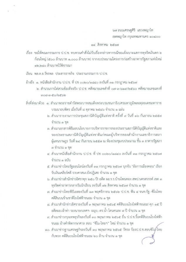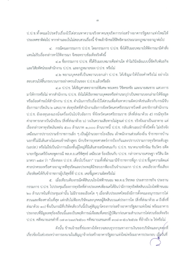 - กรณีไม่ปรากฏพยานเอกสารตามหนังสือนางดารณี ธรเสนา ผู้อำนวยการสำนักไต่สวนการทุจริตภาครัฐ 1 ปฏิบัติราชการแทน เลขาธิการคณะกรรมการ ป.ป.ช. กล่าวอ้างนั้นย่อมมิใช่เป็นหน้าที่ของผู้ร้องเพียงเท่าที่ท่านกล่าวอ้าง หากแต่เป็นอำนาจหน้าที่หลักของ ป.ป.ช.ที่มีอำนาจเรียกพยานเอกสารธุรกรรมทางการเงินของบุคคลหรือนิติบุคคลที่เกี่ยวข้องว่าในห้วงระยะเวลาดังกล่าวมีการถอนเงินสดหรือเช็คหรือแคชเชียร์เช็คเป็นจำนวนมากจากธนาคารใดบริษัทใดไปจ่ายให้กับผู้ใด ท่านเป็น ป.ป.ช.เป็นเจ้าหน้าที่ของรัฐย่อมพึงรู้ถึงอำนาจหน้าที่การตรวจสอบดังกล่าวดีอยู่แล้ว ข้าพเจ้าแนบหนังสือสำนักงาน ป.ป.ช. ที่ ปช 0020/1840 ลงวันที่ 31กรกฎาคม 2567 มาให้ท่านดูว่าเป็นเรื่องเศร้าเพียงใดที่ ป.ป.ช. ไม่ตรวจสอบการทุจริตเงินหล่นจำนวน 500 ล้านบาท 1,000 ล้านบาท
