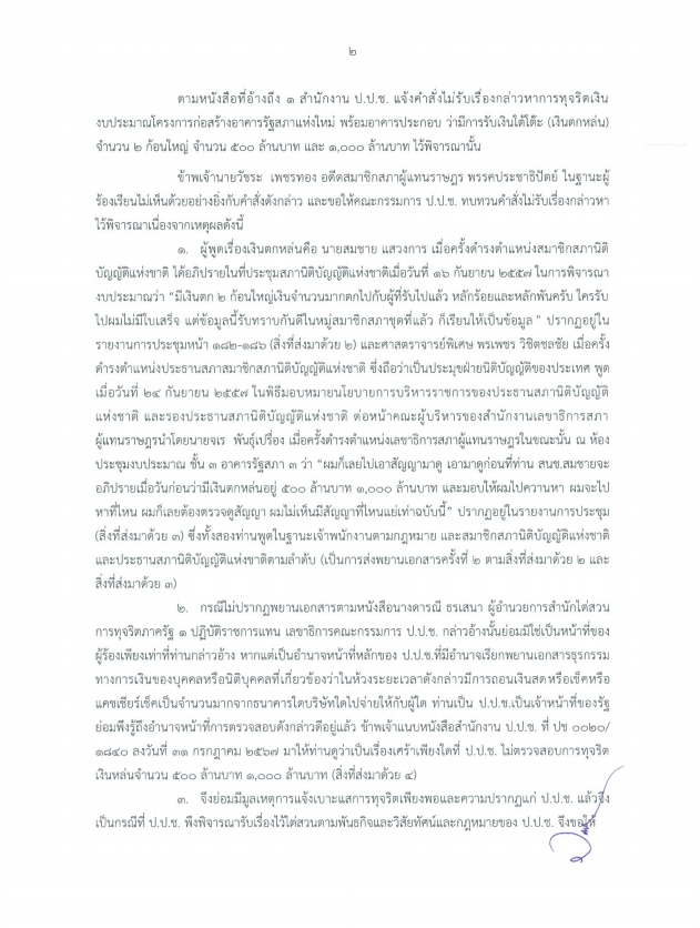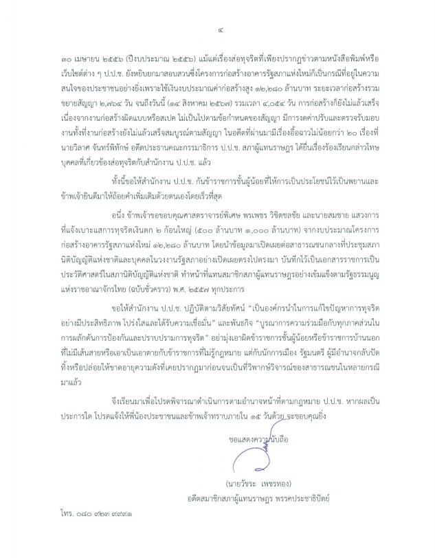 - จึงย่อมมีมูลเหตุการแจ้งเบาะแสการทุจริตเพียงพอและความปรากฏแก่ ป.ป.ช. แล้วจึงเป็นกรณีที่ ป.ป.ช. พึ่งพิจารณารับเรื่องไว้ไต่สวนตามพันธกิจและวิสัยทัศน์และกฎหมายของ ป.ป.ช. จึงขอให้ ป.ป.ช.ทั้งคณะโปรดรับเรื่องไว้ไต่สวนหาความจริงหาคนทุจริตการก่อสร้างอาคารรัฐสภาแห่งใหม่ให้ประเทศชาติต่อไป หากท่านละเว้นไม่สอบสวนเรื่องนี้ ตนจักขอใช้สิทธิตามประมวลกฎหมายอาญาต่อไป