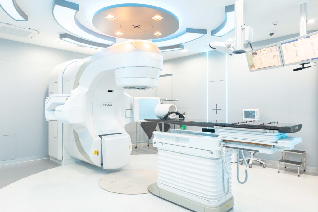 เครื่องฉายรังสีความเข้มข้นสูง (Linear Accelerator รุ่น TrueBeam) เครื่องฉายรังสีภายนอกประสิทธิภาพสูง โดยใช้รังสีโฟตอน ( Photon ) และอิเล็กตรอน ( Electron ) สามารถรักษาได้ทุกเทคนิกของการฉายรังสีภายนอก ได้แก่ การฉายรังสีสามมิติ,การฉายรังสีแบบปรับความเข้ม, การฉายรังสีแบบปรับความเข้มเชิงปริมาตร,รังสีศัลยกรรม,รังสีศัลยกรรมร่างกาย,สามารถปรับตำแหน่งบริเวณฉายรังสีตามการหายใจ,สามารถตรวจสอบความถูกต้องของตำแหน่งการฉายรังสีทั้งแบบ 2 มิติ 3 มิติ และ 4 มิติ มีการฉายแบบความเข้มสูง ลดระยะเวลาในการฉายรังสีเทียบกับแบบปกติสูงสุดประมาณ 4 เท่า เครื่องนี้จึงเหมาะกับผู้ป่วยที่รับการฉายรังสีภายนอกได้ทุกกลุ่ม
