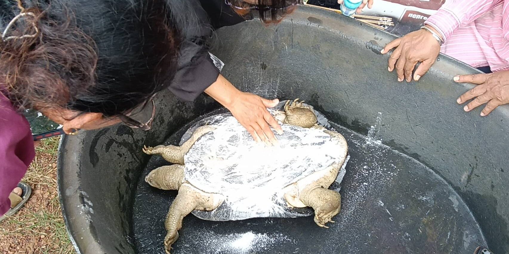 ผู้สื่อข่าวรายงาน เจ้าของบ้านงง เจอเต่ายักษ์เข้าบ้าน บอกว่าตั้งแต่เกิดมายังไม่เคยพบเห็นเต่าตัวใหญ่มากที่สุดเหมือนกับตัวนี้ แถมยังมีความแปลกกว่าเวลาพูดชอบชูหัวออกมาฟัง ลำตัวเป็นสีนิล หรือสีดำ ซึ่งนางสาวกัญญาณัฐ ยอดมา อายุ58ปี อยู่บ้านเลขที่ 111 หมู่ 1 ต.วังโป่ง อ.วังโป่ง จ.เพชรบูรณ์ พบเห็นเมื่อช่วงเช้าจึงนำไปขังไว้ในอ่างเลี้ยงไว้ชั่วคราว พอถึงช่วงกลางวัน จึงนำเต่ามาดูอย่างละเอียด ทำให้พบความแปลกประหลาดสร้างความตื่นเต้น และความดีใจเพราะเชื่อว่าเป็นสัตว์ที่เป็นมงคล ตามความเชื่อโบราณเต่าจะเด่นด้านการมีอายุที่ยืนยาว โบราณบอกว่าบ้านไหนหากมีเต่าคลานเข้าบ้านถือว่าบ้านนั้นจะมีโชคมีลาภ สังเกตที่ลำตัวมีขนาดใหญ่มากกว่าเต่าทั่วๆ ไป คาดว่าอายุมากไม่ต่ำกว่า 60 ปี