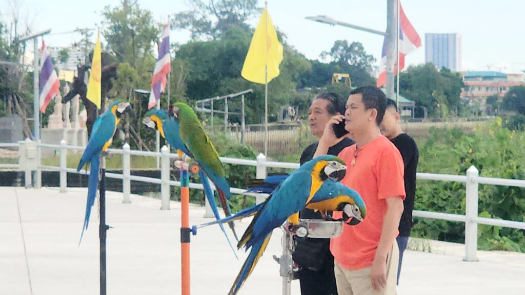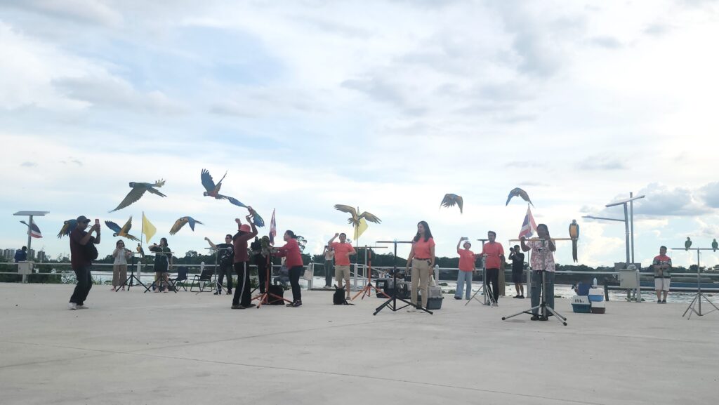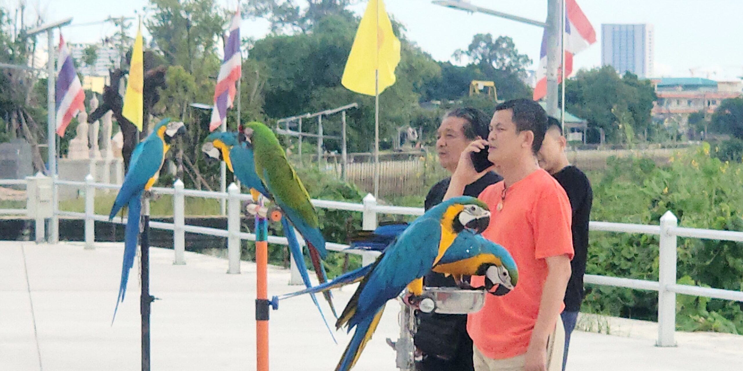 บรรยากาศการปล่อยนกบินอิสระที่บริเวณริมแม่น้ำเจ้าพระยา เหล่าสมาชิกคนเลี้ยงนกบินอิสระที่นิยมเลี้ยงนกแก้วมาคอร์แบบไม่ขังกรง โดยการเลี้ยงนกตั้งแต่เล็กเป็นลูกป้อนโดยปล่อยอิสระ ให้นกได้ออกกำลังกาย นกมีความสุข เจ้าของได้เห็นนกบินอย่างอิสระสามารถกลับมาหาผู้เลี้ยง หรือกลับมาตามคำสั่งของเจ้าของได้คล้ายกับการฝึกสุนัขให้ทำตามสั่ง เมื่อปล่อยนกไปแล้วให้นกได้บิน 5-10 นาที เจ้าของนกจะเรียกนกของตัวเองกลับมา