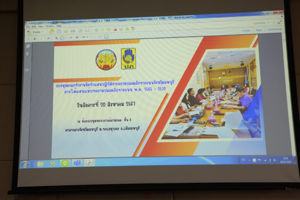 วันที่ 20 สิงหาคม 2567 เวลา 09.30 น. ที่ ห้องประชุมพระปรางค์สามยอด ชั้น 4 ศาลากลางจังหวัดลพบุรี นายวิรพัฒน์ อ่อนสุระทุม หัวหน้าสำนักงานป้องกันและบรรเทาสาธารณภัยจังหวัดลพบุรี เป็นประธานการประชุม คณะทำงานจัดทำแผนปฏิบัติการความปลอดภัยทางถนนจังหวัดลพบุรี พ.ศ. 2567 ภายใต้แผนแม่บทความปลอดภัยทางถนน พ.ศ. 2565 – 2570 โดยมีนางสวามินี อิสระทะ ประชาสัมพันธ์จังหวัดลพบุรี พร้อมด้วย ส่วนราชการ ผู้แทนจากหน่วยงานต่าง ๆ เข้าร่วมประชุม
