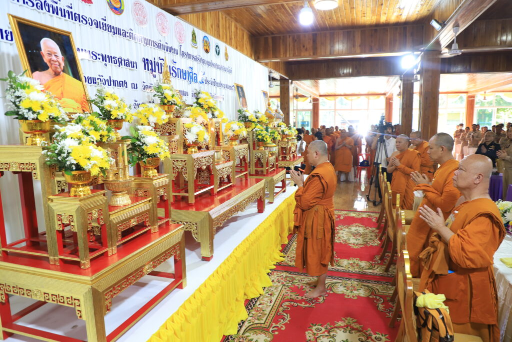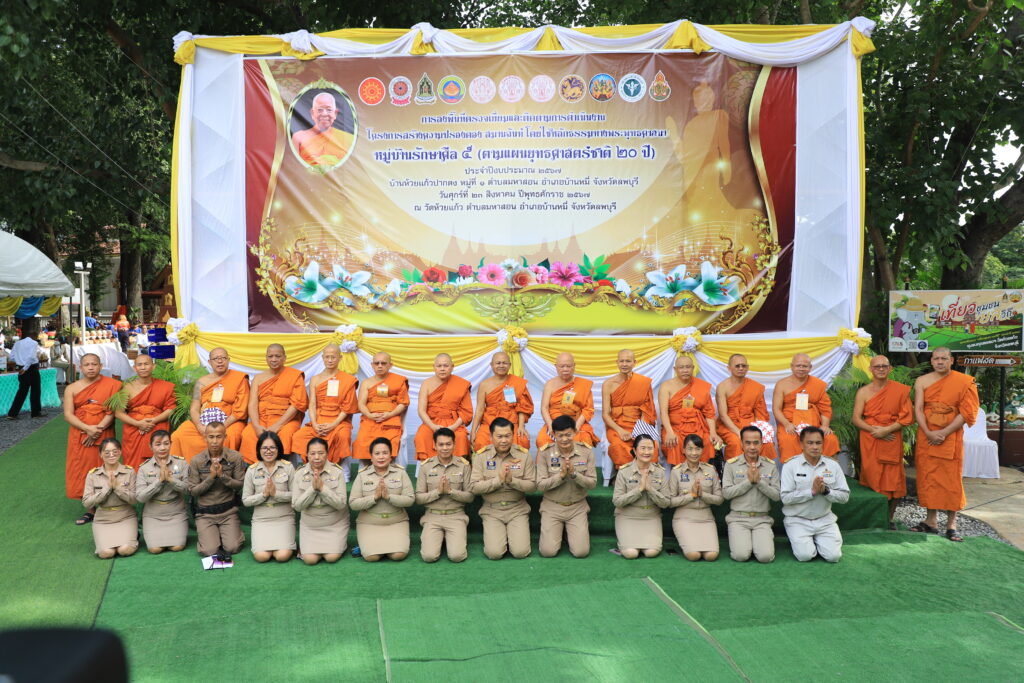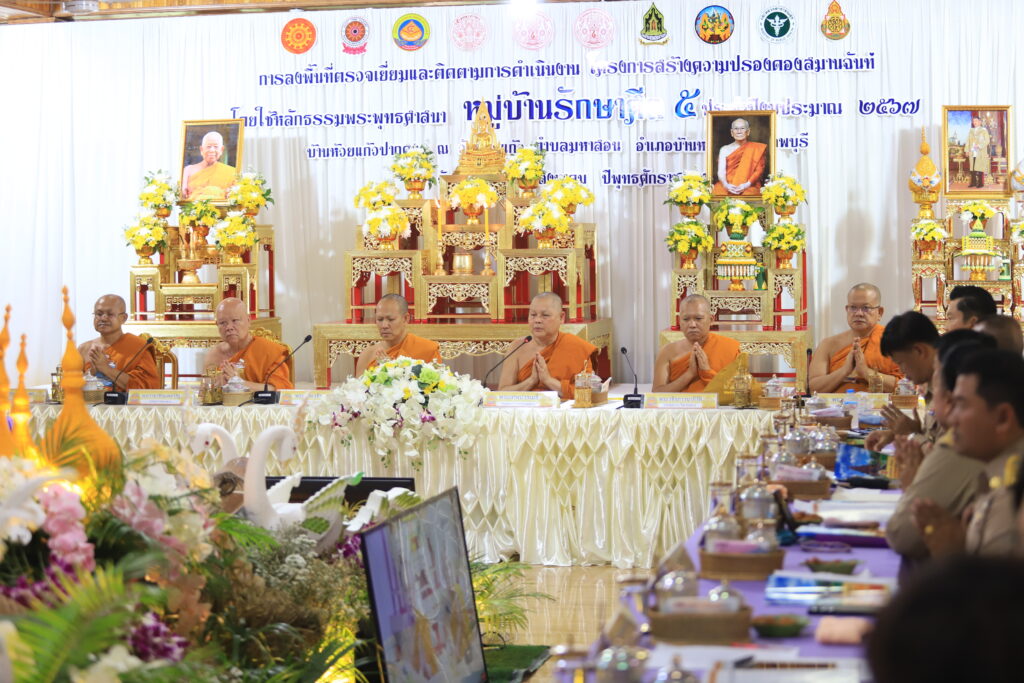 วันที่ 23 สิงหาคม 2567 เวลา 08.30 น. ที่ วัดห้วยแก้ว หมู่ 1 ตำบลมหาสอน อำเภอบ้านหมี่ จังหวัดลพบุรี พระเทพปวรเมธี ประธานคณะกรรมการขับเคลื่อน ระดับหนโครงการสร้างความปรองดองสมานฉันท์โดยใช้หลักธรรมทางพระพุทธศาสนา”หมู่บ้านรักษาศีล 5″ หนกลาง พร้อมด้วยคณะกรรมการขับเคลื่อนฯ ลงพื้นที่ตรวจเยี่ยมและติดตามผลการดำเนินงาน โครงการสร้างความปรองดองสมานฉันท์ โดยใช้หลักธรรมทางพระพุทธศาสนา หมู่บ้านรักษาศีล 5 ณ “หมู่บ้านห้วยแก้วปากดง” หมู่ 1 ตำบลมหาสอน อำเภอบ้านหมี่ จังหวัดลพบุรี โดยมี พระธรรมวชิรสุนทร เจ้าคณะจังหวัดลพบุรี เจ้าอาวาสวัดกวิศรารามราชวรวิหาร พระราชสิริวชิรเวที เจ้าคณะจังหวัดลพบุรี (ธ) เจ้าอาวาสวัดพระนางจามเทวี นายปรัชญา เปปะตัง รองผู้ว่าราชการจังหวัดลพบุรี พร้อมด้วยคณะสงฆ์จังหวัดลพบุรี หัวหน้าส่วนราชการ และพุทธศาสนิกชนชาวลพบุรี ร่วมถวายการต้อนรับ