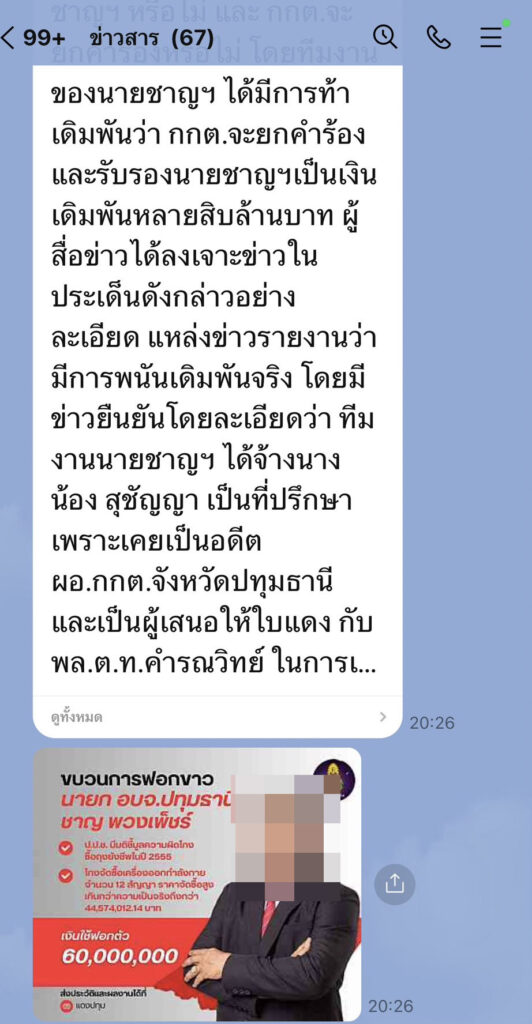 นายชณัฐ รานุรักษ์ เลขาธิการคณะกรรมการลูกปทุมต้นแบบต้านโกง กล่าวว่า เนื่องจากมีความคืบหน้าจากหลายหน่วยงานโดยเฉพาะสำนักงานผู้ตรวจการแผ่นดิน ตามเลขรับที่ 167/2567 ได้รับหนังสือและแจ้งกลับมาแล้วว่าอยู่ระหว่างแสวงหาข้อเท็จจริงที่เกี่ยวข้องทั้งบุคคลและพยานแวดล้อม ส่วนกรณีตามที่มีกระแสข่าวขบวนการฟอกขาว ช่วยผู้สมัครนายก อบจ. คนหนึ่งที่แชร์กันอย่างมากมาย ในสื่อโซเชียลต่างๆ ไม่ใช่แค่ในจังหวัดปทุมแต่ได้ขยายไปหลายจังหวัดหรืออาจจะทั่วประเทศก็อาจจะเป็นไปได้ ซึ่งส่งผลให้มีประชาชนให้ความสนใจเป็นจำนวนมาก ทั้งทางสื่อออนไลน์และกลุ่มไลน์ต่าง ๆ เกี่ยวกับการฟอกขาวเพื่อเปิดทางให้ผู้สมัครนายก อบจ. ปทุมคนหนึ่งหลุดหรือยกคำร้อง เพื่อเปิดทางให้ได้เข้ารับตำแหน่งนายกองค์การบริหารส่วนจังหวัดปทุมธานี โดยทางกลุ่มลูกปทุมต้นแบบต้านโกงได้ดำเนินการตรวจพบว่าข้อความที่มีการอธิบายการทำงานของขบวนการ ถ้าเป็นไปตามข้อความที่มีการแชร์นั้นจริงก็อาจจะมีพิรุธหลายอย่าง เช่นอ้างว่าบางคนไม่เกี่ยวข้องกับการสอบสวนและไปราชการที่อื่นแต่กลับมาทำหนังสือแสดงความคิดเห็นที่แตกต่างกันชุดสอบสวนที่เข้าทำงานกันอยู่ รวมถึงผลประโยชน์ที่บางคนจะได้รับ มีมูลค่าเป็นสิบล้านเพื่อไปแบ่งกับคนที่ร่วมขบวนการ
