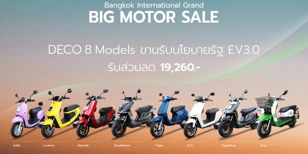 นายกฤตเมธ ตั้งพิชญโพธิวัฒน์ ประธานเจ้าหน้าที่บริหารบริษัท เดโก้ กรีน เอนเนอร์จี จำกัด กล่าวว่า ทาง DECO ได้นำรถมอเตอร์ไซค์ไฟฟ้าทั้งหมด 8 รุ่น เข้าร่วมงาน Big Motor Sale 2024 ณ ไบเทค บางนา ในวันที่ 23 สิงหาคม – 1 กันยายน 2567 ซึ่งรถทุกรุ่นนี้ได้รับการสนับสนุนจากรัฐบาลเพื่อส่งเสริมการใช้ยานยนต์ไฟฟ้าในประเทศไทย ซึ่งยังคงได้รับการสนับสนุนต่อเนื่องจนถึงสิ้นปี 2568