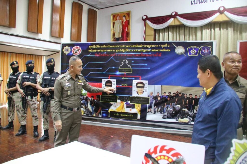 พร้อมคณะฯ ร่วมแถลงข่าวจับกุมยาเสพติด พร้อมของกลาง ยาบ้า จำนวน 1,800,000 เม็ด ตามนโยบายของรัฐบาลเน้นแก้ไขปัญหายาเสพติดทั้งระบบด้วยการสืบสวนขยายผลและวิเคราะห์