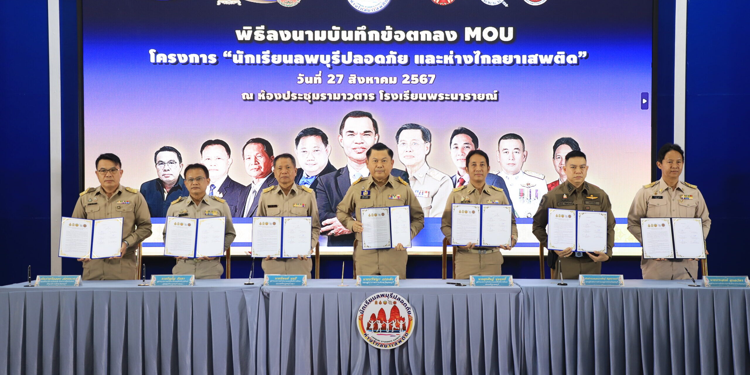 วันที่ 27 สิงหาคม 2567 ณ หอประชุมรามาวตาร โรงเรียนพระนารายณ์ จังหวัดลพบุรี นายปรัชญา เปปะตัง รองผู้ว่าราชการจังหวัดลพบุรี เป็นประธานในพิธีลงนามบันทึกข้อตกลงความร่วมมือ (MOU)และการประชุมจัดทำแผนจุดเสี่ยงของสถานศึกษาในสังกัดจังหวัดลพบุรีตามโครงการ “นักเรียนลพบุรีปลอดภัย และห่างไกลยาเสพติด”โดยมี นายศุภศิษฎ์ นุ่มฤทธิ์ ผู้อำนวยการสำนักงานเขตพื้นที่การศึกษามัธยมศึกษาลพบุรี พร้อมด้วยหัวหน้าส่วนราชการ ผู้บริหารสถานศึกษา รองผู้บังคับการตำรวจภูธรจังหวัดลพบุรี ผู้อำนวยการสำนักงานอาชีวศึกษาจังหวัดลพบุรี ครูและคณะกรรมการดำเนินงานตามโครงการฯผู้เข้าร่วมประชุม