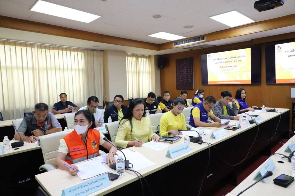 เมื่อวันที่ 28 ส.ค.67 เวลา 10.00 น. ที่ ห้องประชุมข้าวหอมปทุม ศาลากลางจังหวัดปทุมธานี นายภาสกร บุญญลักษม์ ผู้ว่าราชการจังหวัดปทุมธานี เป็นประธานการประชุมการเตรียมความพร้อมรับสถานการณ์อุทกภัยจังหวัดปทุมธานี ปี 2567 โดยมีหน่วยงานที่เกี่ยวข้อง ได้แก่ อุตุนิยมวิทยาจังหวัดปทุมธานี โครงการชลประทานจังหวัดปทุมธานี โครงการส่งน้ำและบำรุงรักษารังสิตเหนือ โครงการส่งน้ำและบำรุงรักษารังสิตใต้ โครงการส่งน้ำและบำรุงรักษาพระยาบันลือ องค์การบริหารส่วนจังหวัดปทุมธานี สำนักงานป้องกันและบรรเทาสาธารณภัยจังหวัดปทุมธานี พร้อมด้วย 3 อำเภอที่มีพื้นที่เสี่ยงน้ำล้นตลิ่ง ได้แก่ อำเภอเมืองปทุมธานี อำเภอสามโคก และอำเภอลาดหลุมแก้ว และแขวงทางหลวง เข้าร่วมประชุม
