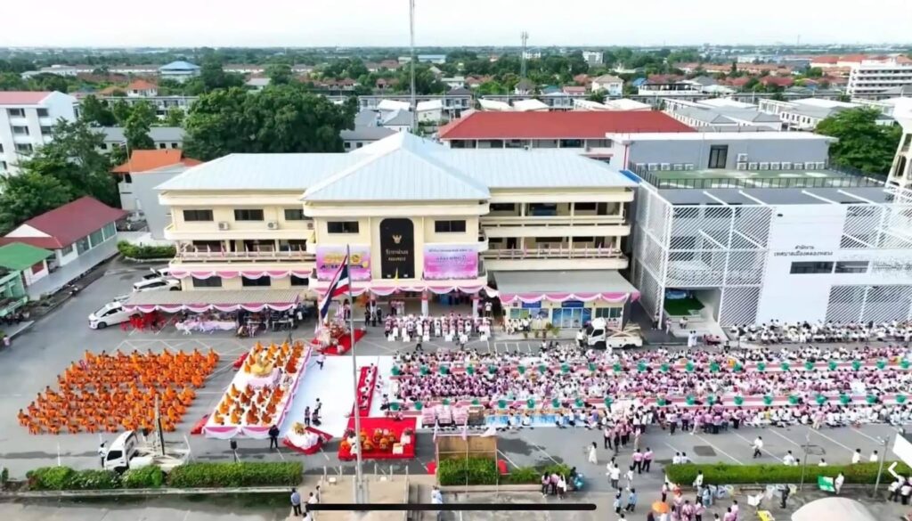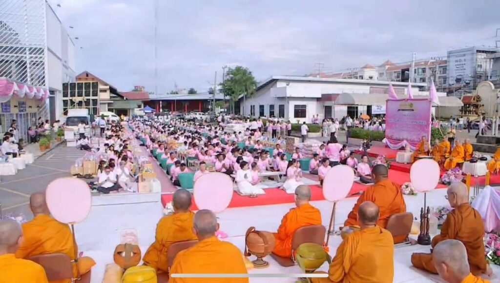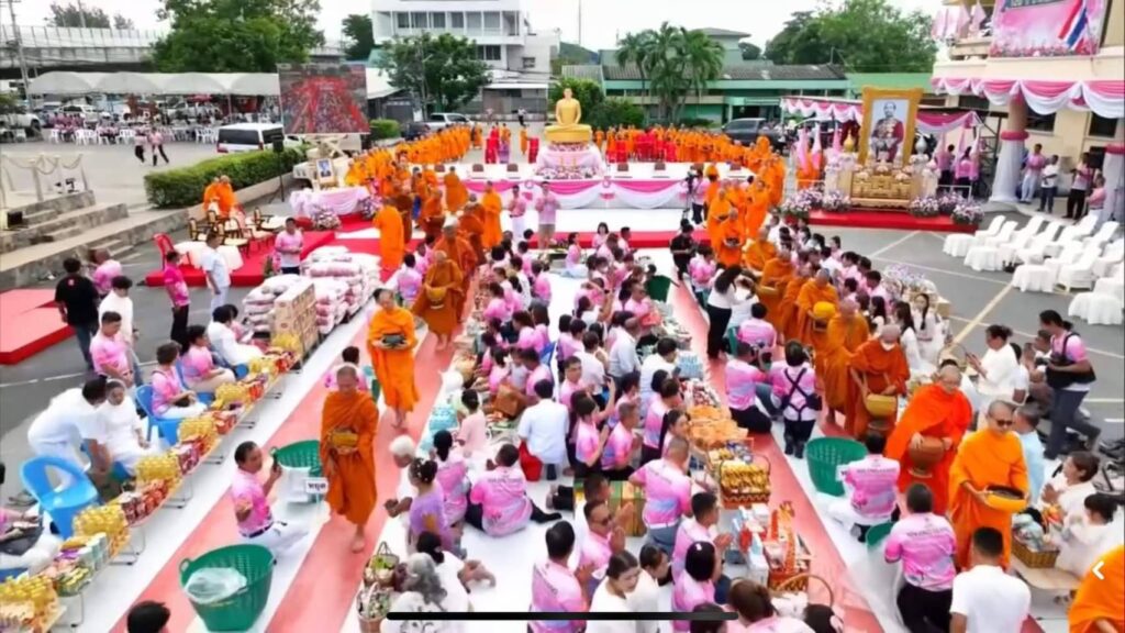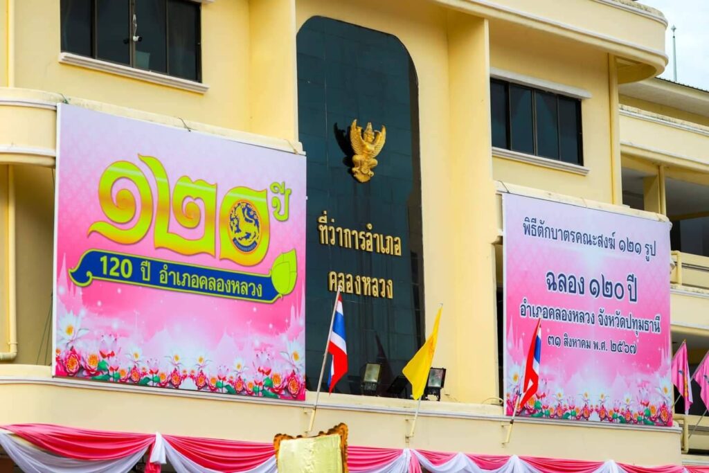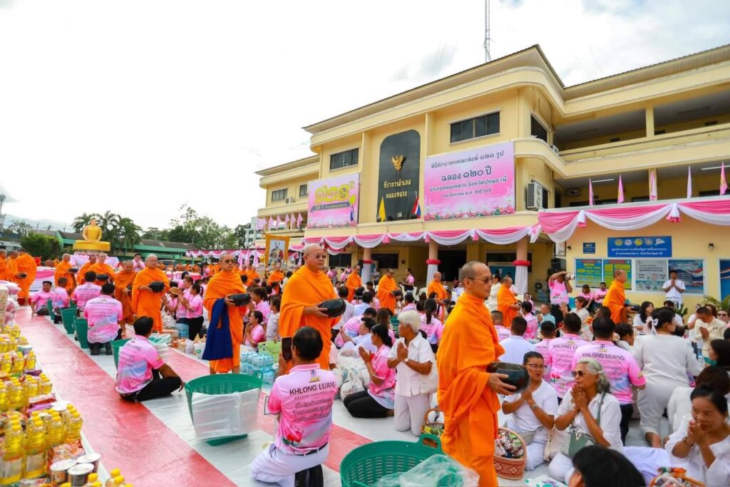 บรรยากาศในพิธีทำบุญตักบาตรคณะสงฆ์ 121 รูป ฉลอง 120 ปี อำเภอคลองหลวง จังหวัดปทุมธานี มีพระธรรมรัตนาภรณ์ ที่ปรึกษาเจ้าคณะภารค 1 เจ้าอาวาสวัดเขียนเขต พระอารามหลวง เป็นประธานสงฆ์ พร้อมด้วยเจ้าคณะพระสังฆาธิการและคณะสงฆ์ 24 วัด ในเขตพื้นที่อำเภอคลองหลวง เป็นเนื้อนาบุญ เจริญพระพุทธมนต์ และรับบิณฑบาต ทั้งนี้เพื่อถวายเป็นพุทธบูชา สร้างความเข้มแข็งทางศีลธรรม ส่งเสริมภาพลักษณ์ของชาวคลองหลวงสร้างความร่วมมือกันระหว่างหน่วยงานทั้งภาครัฐ ภาคเอกชน และภาคประชาชนในท้องถิ่น ที่สำคัญอย่างยิ่งคือ อาหารที่ได้จากการตักบาตรจะนำไปช่วยเหลือผู้ประสบภัยน้ำท่วมและภัยพิบัติต่างๆ และพระภิกษุสงฆ์ 323 วัด ที่รักษาพระพุทธศาสนาใน 4 จังหวัดชายแดนภาคใต้ นอกจากนี้ภายในงานยังมีบุญพิธีอุทิศส่วนกุศลให้กับผู้มีคุณูปการต่ออำเภอคลองหลวงเป็นกตัญญูบูชาอีกด้วย.
