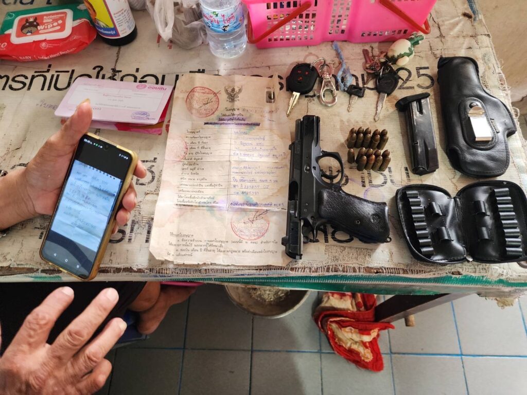 เมื่อวันที่ 1 ก.ย. พล.ต.ท.วรวัฒน์ วัฒน์นครบัญชา ผบช.สอท. สั่งการให้ พล.ต.ต.ภูมิพัฒน์ ภัทรศรีวงษ์ชัย ผบก.สอท.5 พ.ต.อ.บัญชา ศรีสุข รอง ผบก.สอท.5 พ.ต.อ.ฐาปกรณ์ หนุมาศ ผกก.3 บก.สอท.5 นำหมายค้นศาลจังหวัดนครศรีธรรมราช ที่ 365/2567 ลงวันที่ 29 ส.ค.2567 เข้าตรวจค้นบ้านหลังหนึ่งใน ต.ขนอม อ.ขนอม จ.นครศรีธรรมราช พร้อมจับกุมตัวนายสมพร หรือจุน อายุ 60 ปี พร้อมของกลางโทรศัพท์มือถือ 1 เครื่อง อาวุธปืนยี่อห้อ ยี่ห้อ CZ 1 กระบอก พร้อมกระสุนปืน 19 นัด รถจักรยานยนต์พ่วงข้าง 1 คัน สมุดบัญชีธนาคาร และเอกสารสัญญากู้ยืมเงินจำนวนหนึ่ง