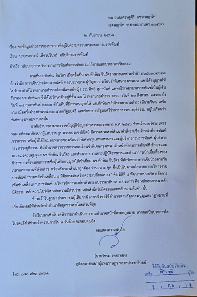 อาศัยอำนาจตามพระราชบัญญัติข้อมูลข่าวสารของราชการ พ.ศ. ๒๕๔๐ ข้าพเจ้านายวัชระ เพชรทอง อดีตสมาชิกสภาผู้แทนราษฎร พรรคประชาธิปัตย์ มีความประสงค์สำเนาคำสั่งรายชื่อเจ้าหน้าที่ราชทัณฑ์ /เวรตรวจ หรือผู้ที่ได้รับมอบหมายของเรือนจำพิเศษกรุงเทพมหานครและผู้บริหารกรมราชทัณฑ์ ผู้บริหารกระทรวงยุติธรรม ที่มีอำนาจตรวจราชการเขตเรือนจำพิเศษกรุงเทพ เจ้าหน้าที่กรมราชทัณฑ์ที่เข้าเวรและตรวจเวรควบคุมดูแล นช.ทักษิณ ชินวัตร และสำเนารายงานการปฏิบัติราชการและสำเนาการเบิกเบี้ยเลี้ยงของข้าราชการทั้งหมดและรายชื่อผู้ได้รับอนุญาตให้เข้าเยี่ยม นช.ทักษิณ ชินวัตร ที่พักรักษาอาการเจ็บป่วยตามวันเวลาและสถานที่ดังกล่าว พร้อมรับรองสำเนาถูกต้อง จำนวน ๑ ชุด ซึ่งเป็นไปตามนโยบายการบริหารงานราชทัณฑ์ “รวมพลังขับเคลื่อน ๘ มิติยกระดับสร้างความเปลี่ยนแปลง” คือ มิติที่ ๘ พัฒนาระบบบริหารจัดการเพื่อขับเคลื่อนงานราชทัณฑ์ (บริหารจัดการองค์กรด้วยระบบธรรมาภิบาล ๖ ประการ คือ หลักคุณธรรม หลักนิติธรรม หลักความโปร่งใส หลักความมีส่วนร่วม หลักสํานึกรับผิดชอบและหลักความคุ้มค่า) นั้น