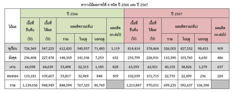 ตารางไม้ผลภาคใต้ 4 ชนิด ปี 2566 และ ปี 2567