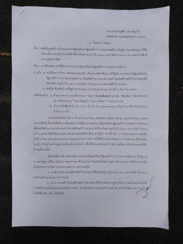 ทั้งนี้ผมได้ยื่นหนังสือคัดค้านการยุบเลิกโรงไฟฟ้าและค่าไฟมีราคาแพงให้กับท่านเมื่อคราวไปตรวจราชการเยี่ยมสถานที่สร้างโรงไฟฟ้าสุราษฎร์ธานี ตำบลเขาหัวควาย อำเภอพุนพิน จังหวัดสุราษฎร์ธานี เมื่อวันที่ 29 มิถุนายน 2567 ท่านก็กล่าวหาข้าพเจ้าว่า “ไปเอาข้อมูลบ้า ๆ มาจากไหน” และสหภาพแรงงานรัฐวิสาหกิจการไฟฟ้าฝ่ายผลิตแห่งประเทศไทย (สร.กฟผ.) ได้แถลงต่อสื่อยืนยันข้อเท็จจริงเกี่ยวกับข้อมูลยุบเลิกโรงไฟฟ้าเป็นเรื่องจริงปรากฏหลักฐานข้อมูลต่าง ๆ ตามแถลงการณ์ สร.กฟผ. แต่ท่านก็ไม่ดำเนินการให้แต่ประการใด