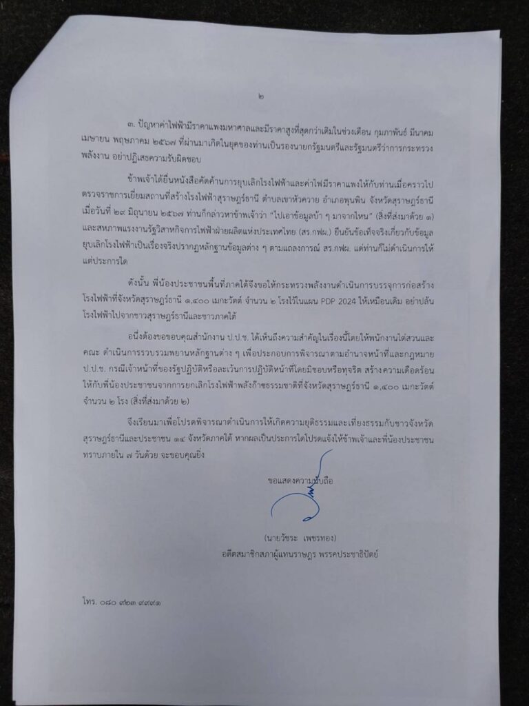 ดังนั้น พี่น้องประชาชนพื้นที่ภาคใต้จึงขอให้กระทรวงพลังงานดำเนินการบรรจุการก่อสร้างโรงไฟฟ้าที่จังหวัดสุราษฎร์ธานี 1,400 เมกะวัตต์ จำนวน 2 โรงไว้ในแผน PDP 2024 ให้เหมือนเดิม อย่าปล้นโรงไฟฟ้าไปจากชาวสุราษฎร์ธานีและชาวภาคใต้