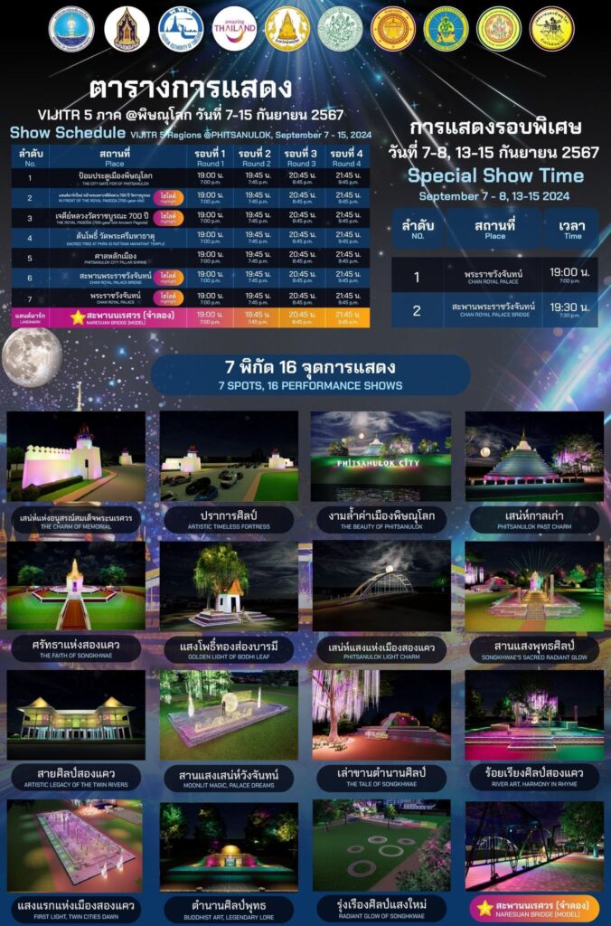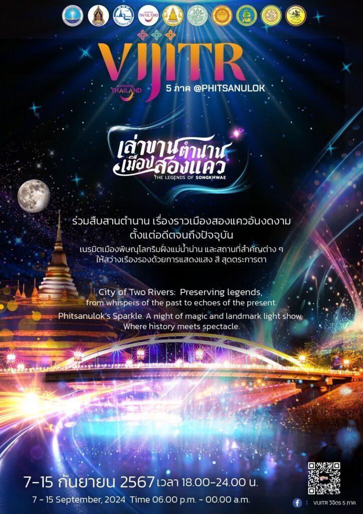 เมื่อวันที่ 7 กันยายน 2567 นายภูสิต สมจิตต์ ผู้ว่าราชการจังหวัดพิษณุโลก และนายอภิชัย ฉัตรเฉลิมกิจ รองผู้ว่าการด้านสินค้าและธุรกิจท่องเที่ยว การท่องเที่ยวแห่งประเทศไทย (ททท.) ร่วมเป็นประธานในพิธีเปิดงาน “VIJITR 5 ภาค @PHITSANULOK” โดย ททท. ซึ่งมีกำหนดจัดงานในวันที่ 7-15 กันยายน 2567 ตั้งแต่เวลา 18.00 – 24.00 น. ณ อำเภอเมืองพิษณุโลก จังหวัดพิษณุโลก แต่งแต้มสีสันยามค่ำคืนของเมืองพิษณุโลก ภายใต้คอนเซปต์ “เล่าขานตำนานเมืองสองแคว THE LEGENDS OF SONGKHWAE” สืบสานตำนานและประวัติศาสตร์ เมืองสองแควอันงดงามตั้งแต่อดีตจนปัจจุบัน โดยเนรมิตเมืองพิษณุโลกริมฝั่งแม่น้ำน่าน และสถานที่สำคัญต่าง ๆ ให้สว่างเรืองรองด้วยเทคนิคแสง เสียง เพื่อสร้างแรงบันดาลใจในการท่องเที่ยวผ่านกิจกรรมท่องเที่ยวเชิงสร้างสรรค์ พร้อมต้อนรับนักท่องเที่ยวชาวต่างชาติและชาวไทยให้เดินทางมาสัมผัสกับความงดงามแห่งประวัติศาสตร์และวัฒนธรรมของเมืองสองแคว