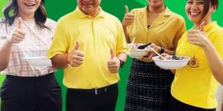 พร้อมกับทีมงานและเจ้าหน้าที่เทศบาลตำบลเขาพระงาม กำลังยืนมุง ล้อมร้านก๋วยเตี๋ยวรถพ่วง