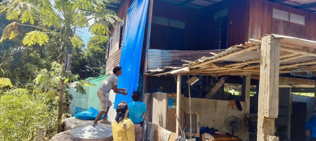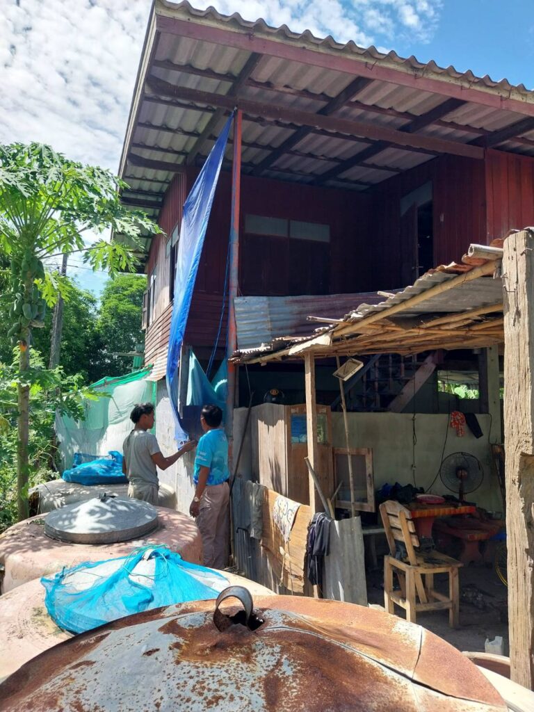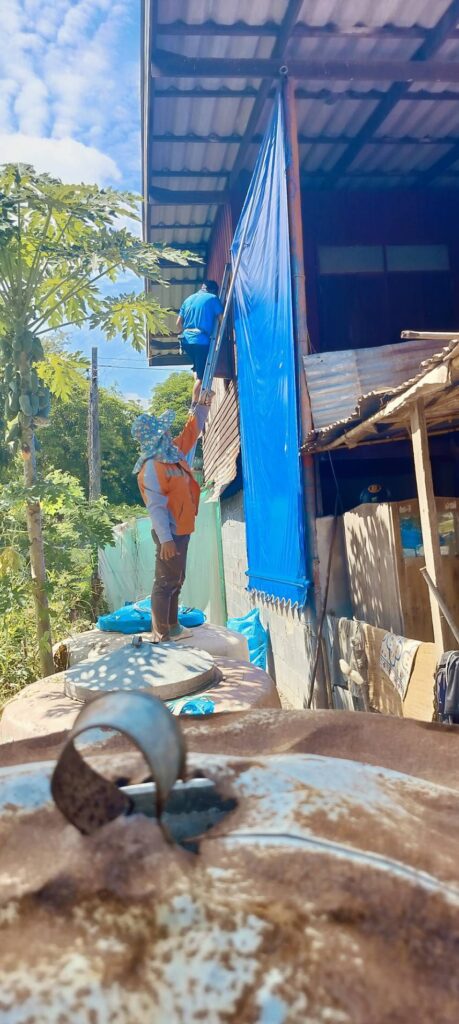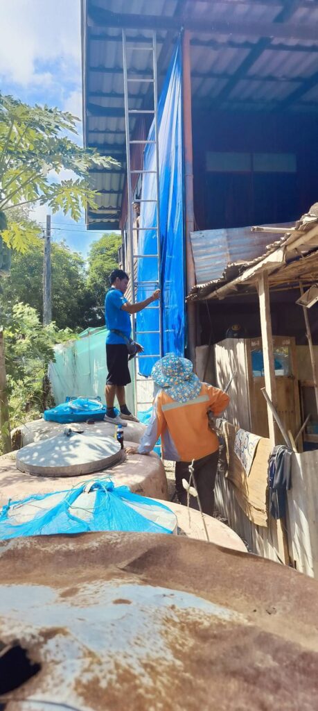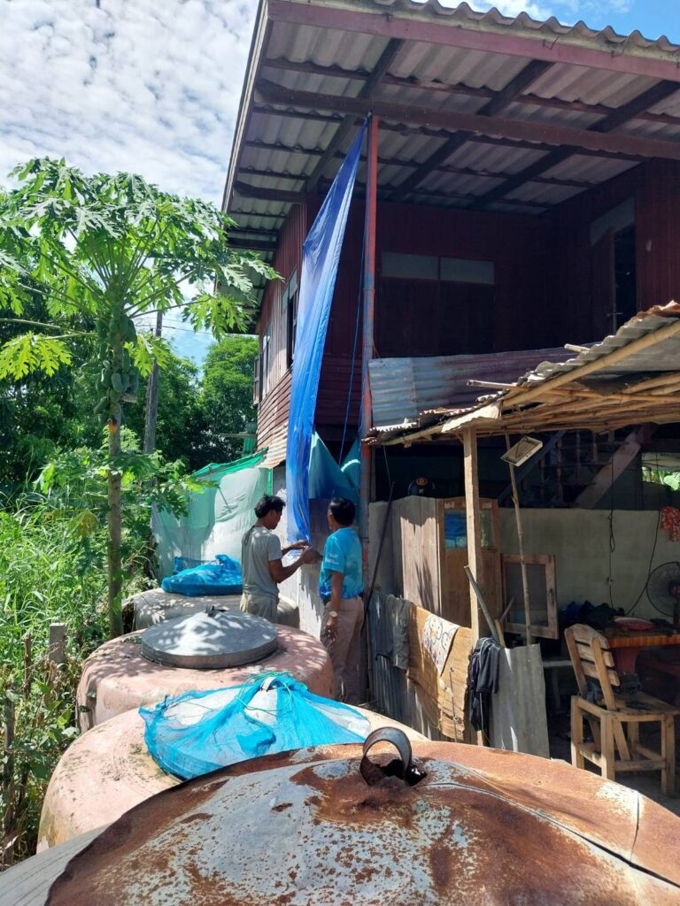 ซึ่เป็นผู้ป่วยติดเตียง” ที่ท่าน นายก อบต.หนองทรายขาว ได้ลงพื้นที่เคยมาเยี่ยมได้มามอบ ผ้าอ้อมแพมเพิสผู้ใหญ่ , ข้าวสาร, น้ำดื่ม, ไข่ไก่ แล้วเห็นนางสังวาลย์ นิ่มคล้าย นอนอาศัยพักผ่อนหหลับนอน เมื่อเวลาฝนตกน้ำฝน จะสาด ทำให้เดือดร้อน วันนี้จึงได้จ้างช่างมาทำการติดตั้งกันสาดการบริเวณดังกล่าวกันแดด กันลม กัน ละอองฝน ( โดยท่าน นายก อบต.หนองทรายขาว ได้บริจาคเงินส่วนตัว เป็นจำนวน 3,000 บาท ) ในการจ้างช่างมาดำเนินการเพื่อเป็นการบรรเทาความเดือดร้อนในครั้งนี้