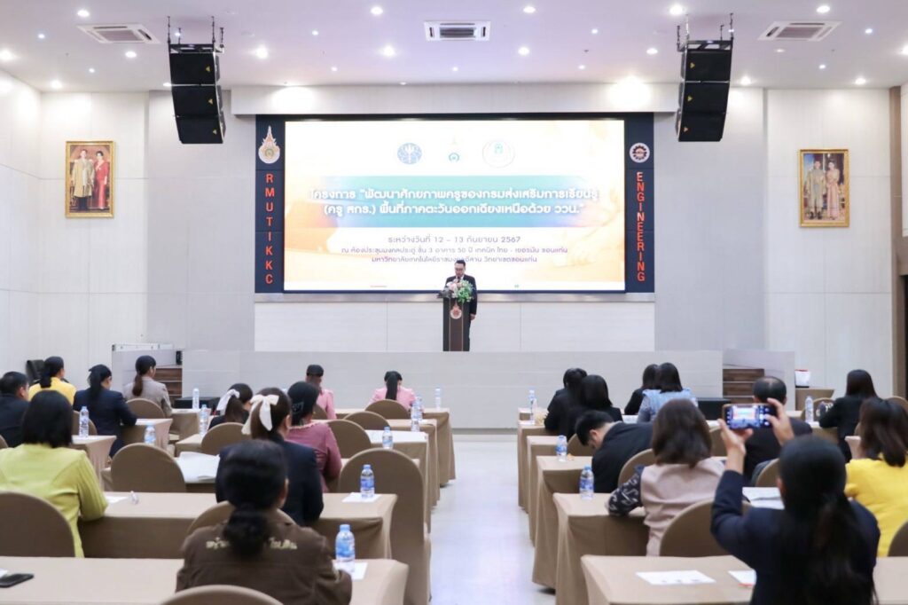 เมื่อวันที่ 13 กันยายน 2567 : นายธนากร ดอนเหนือ อธิบดีกรมส่งเสริมการเรียนรู้ มอบหมายให้ ดร.ชัยพัฒน์ พันธุ์วัฒนสกุล รองอธิบดีกรมส่งเสริมการเรียนรู้ เป็นประธานกล่าวเปิดโครงการพัฒนาศักยภาพครูของกรมส่งเสริมการเรียนรู้ (ครู สกร.) พื้นที่ภาคตะวันออกเฉียงเหนือ ด้วย ววน.และขอบคุณทุกเครือข่ายความร่วมมือ โดยมี นายปริญ ชัยสิทธิ์ รองอธิบดีมหาวิทยาลัยเทคโนโลยีราชมงคลอีสาน (มทร.อีสาน วิทยาเขตขอนแก่น) กล่าวต้อนรับ และ นายเอกพงษ์ มุสิกะเจริญ ผู้อำนวยการกองส่งเสริมและประสานเพื่อประโยชน์ทางวิทยาศาสตร์วิจัยและนวัตกรรม (กปว) ได้กล่าวถึงความร่วมมือการดำเนินงานของ (สป.),(อว.) และ (สกร.) โดยมี นางสาวเอื้อมพร ศรีภูวงศ์ ผู้อำนวยการกลุ่มส่งเสริมกิจการการศึกษาและเครือข่าย,นายบุญกิจ อุ่นพิกุล ผู้ช่วยอธิการบดีฯ,ผศ.ดร.ศุภฤกษ์ ชามงคลประดิษฐ์ คณบดีคณะวิศวกรรมศาสตร์,คณะผู้บริหาร,อาจารย์ประจำมหาวิทยาลัย พร้อมด้วยผู้บริหารสถานศึกษา (สกร.) ข้าราชการ ครูและผู้ที่เกี่ยวข้องร่วมต้อนรับและเข้ารับการอบรม ณ ห้องประชุมมงคลประดู่ อาคาร 50 ปี เทคนิค ไทย-ยอรมัน ขอนแก่น