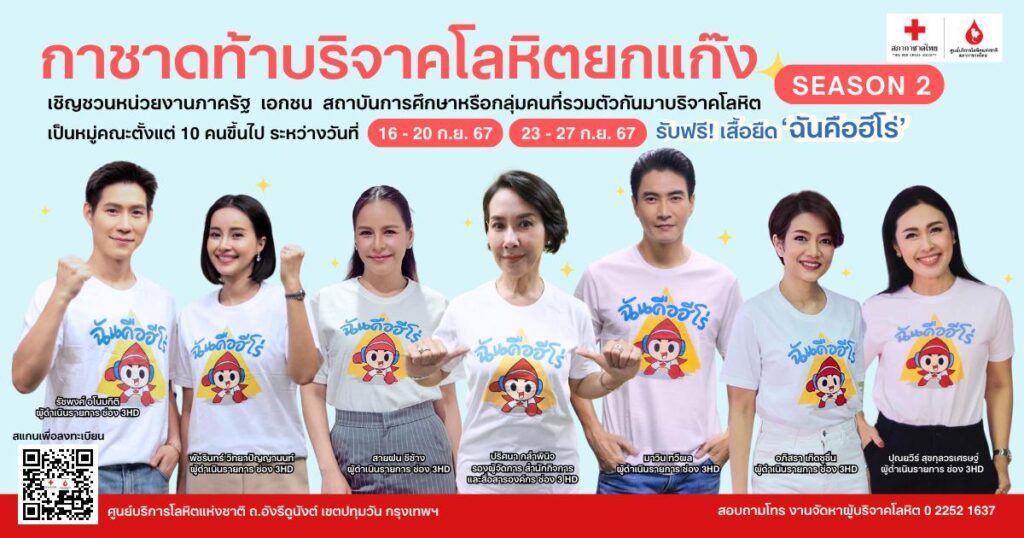 ศูนย์บริการโลหิตแห่งชาติ สภากาชาดไทย ต่อเนื่องโครงการ กาชาดขอท้าบริจาคเลือด #ยกแก๊ง Season 2 รวมกลุ่มพิธีกรช่อง 3 แท็กทีมร่วมสนับสนุนกิจกรรม เชิญชวนผู้มีจิตศรัทธา บริจาคเลือดแบบหมู่คณะ ณ ศูนย์บริการโลหิตแห่งชาติ ถ.อังรีดูนังต์ ภายในเดือนกันยายน 2567 นี้