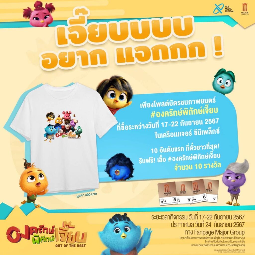 ภาพยนตร์แอนิเมชัน “องครักษ์พิทักษ์เจี๊ยบ Out of the Nest” ที่ทำรายได้แรงเกินต้านจนขึ้นแท่นแอนิเมชันไทยที่ทำรายได้เปิดตัววันแรกสูงสุดตลอดกาล T&B Media Global จัด 2 แคมเปญพิเศษ มาให้แฟนๆ กับ แคมเปญแรก องครักษ์พิทักษ์เจี๊ยบ .. แจกความสด ฟรี!! ไข่ไก่ CP ดีต่อใจทุกเพศทุกวัย “รับความสด” มาเเจกให้อิ่มกันทั้งบ้านเมื่อซื้อตั๋วชมภาพยนตร์ “Out of the nest” องครักษ์พิทักษ์เจี๊ยบ จำนวน 2 ใบ รับไปเลยไข่ไก่สด CP แพ็ค 10 เบอร์ 1 (มูลค่า 73 บาท) ฟรี!! ตั้งแต่วันที่ 14-29 กันยายนนี้ ที่เมเจอร์ ซีนีเพล็กซ์ (10 สาขาร่วมรายการ ดูรายละเอียดได้ใน facebook Out of the Nest และ CP Brand) และ แคมเปญที่สอง “เจี๊ยบอยากแจก” เพียงโพสต์บัตรชมภาพยนตร์ #องครักษ์พิทักษ์เจี๊ยบ ที่ซื้อระหว่างวันที่ 17-22 กันยายน 2567 ในเครือเมเจอร์ ซีนีเพล็กซ์ 10 อันดับแรก ที่ตั๋วยาวที่สุด !รับฟรี! เสื้อ #องครักษ์พิทักษ์เจี๊ยบ จำนวน 10 รางวัล ( รางวัลละ 390 บาท ) โดยมีระยะเวลากิจกรรม ระหว่างวันที่ 17 – 22 กันยายน 2567 และจะประกาศผลในวันที่ 24กันยายน