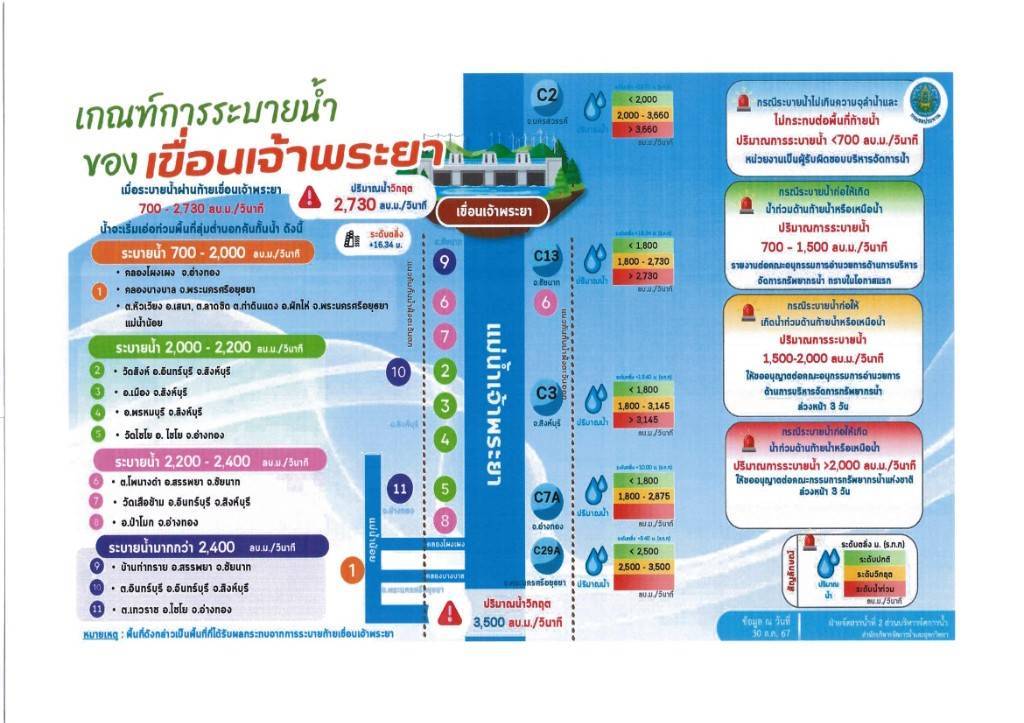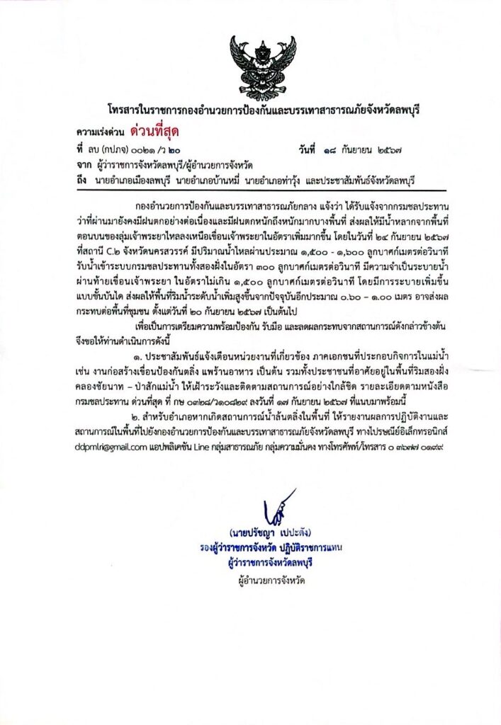 นายอำพล อังคภากรณ์กุล ผู้ว่าราชการจังหวัดลพบุรี เปิดเผยว่า ตามที่กองอำนวยการป้องกันและบรรเทาสาธารณภัยกลาง ได้รับแจ้งจากกรมชลประทานว่าที่ผ่านมายังคงมีฝนตกอย่างต่อเนื่องและมีฝนตกหนักถึงหนักมากบางพื้นที่ ส่งผลให้มีน้ำหลากจากพื้นที่ตอนบนของลุ่มเจ้าพระยาไหลลงเหนือเชื่อนเจ้าพระยาในอัตราเพิ่มมากขึ้น จึงมีความจำเป็นระบายน้ำ ผ่านท้ายเขื่อนเจ้าพระยา ในอัตราไม่เกิน 1,500 ลูกบาศก์เมตรต่อวินาที โดยมีการระบายเพิ่มขึ้นแบบขั้นบันได ส่งผลให้พื้นที่ริมน้ำระดับน้ำเพิ่มสูงขึ้นจากปัจจุบันอีกประมาณ 0.60 – 1.00 เมตร อาจส่งผลกระทบต่อพื้นที่ชุมชน ตั้งแต่วันที่ 20 กันยายน 2567 เป็นต้นไป จึงขอให้ ห้างร้าน ที่ประกอบกิจการบริเวณริมคลองชัยนาท – ป่าสัก แม่น้ำลพบุรี และประชาชนที่อาศัยอยู่บริเวณพื้นที่เสี่ยงเฝ้าระวังติดตามสถานการณ์น้ำอย่างใกล้ชิด