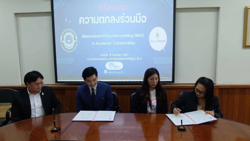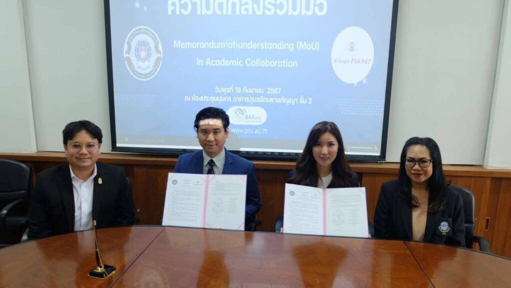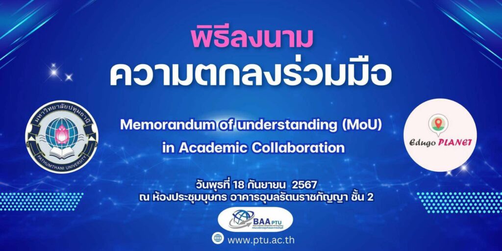 เมื่อวันที่ 18 กันยายน 2567 พิธีลงนาม ความตกลงร่วมมือ ระหว่างมหาวิทยาลัยปทุมธานี กับ EDUGO Planet (บริษัท เอ็ดดูโก แพลนเน็ท จำกัด) ณ ห้องประชุมบุษกร มหาวิทยาลัยปทุมธานี โดยมีเป้าประสงค์ในการพัฒนามาตรฐานคุณภาพการศึกษาให้เกิดหลักสูตรระยะสั้นในรูปแบบ Reskill & Upskill ที่ทันสมัย และสนับสนุนการเรียนการสอนด้านวิชาชีพแก่นักศึกษาและบุคคลที่สนใจศึกษาต่อ โดยมี ผศ.ดร.นิธิมา ยืนยง รองอธิการบดี มหาวิทยาลัยปทุมธานี นายภรัณยู ฉายดิลก กรรมการบริหารบริษัท เอ็ดดูโก แพลนเน็ท จำกัด ลงนามในบันทึกความตกลงร่วมมือทางวิชาการ มี ผศ.ดร.อุทัยรัตน์ เมืองแสน คณบดีคณะบริหารธุรกิจและการบัญชี ผศ.ดร.กฤศนพัชญ์ บุญช่วย หัวหน้าสาขาวิชาการจัดการอุตสาหกรรมท่องเที่ยวและการบริการ นายวรรธนสกล รักปทุม กรรมการบริหารร่วมบริษัท เอ็ดดูโก แพลนเน็ท จำกัด เป็นสักขีพยาน พร้อมคณาจารย์