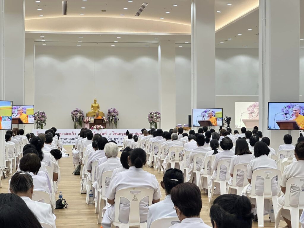 บรรยากาศภายในพิธีอบรมอุบาสิกาแก้ว ตัวแทนทอดกฐิน 30,000 วัด ทั่วไทย มีพิธีบวชอุบาสกแก้ว อุบาสิกาแก้ว และพิธีมอบผ้าสไบให้แก่ผู้เข้าอบรม โดยโครงการอบรมอุบาสิกาแก้วจัดขึ้น 3 รุ่น ในช่วงระหว่างวันที่ 6-8 , 13-15 และ 20-22 กันยายน ณ ศูนย์ส่งเสริมศีลธรรมทุกอำเภอทั่วประเทศ โดยมีผู้เข้าอบรมมากกว่า 30,000 ท่านจากทั่วประเทศ เปิดโอกาสให้สุภาพสตรีอายุตั้งแต่ 18-70 ปี เข้ารับการปลูกฝังศีลธรรมและอุดมการณ์พระพุทธศาสนาให้มีความมั่นคงในพระรัตนตรัย และสามารถนำธรรมะที่เรียนรู้จากโครงการไปใช้ในชีวิตประจำวันได้