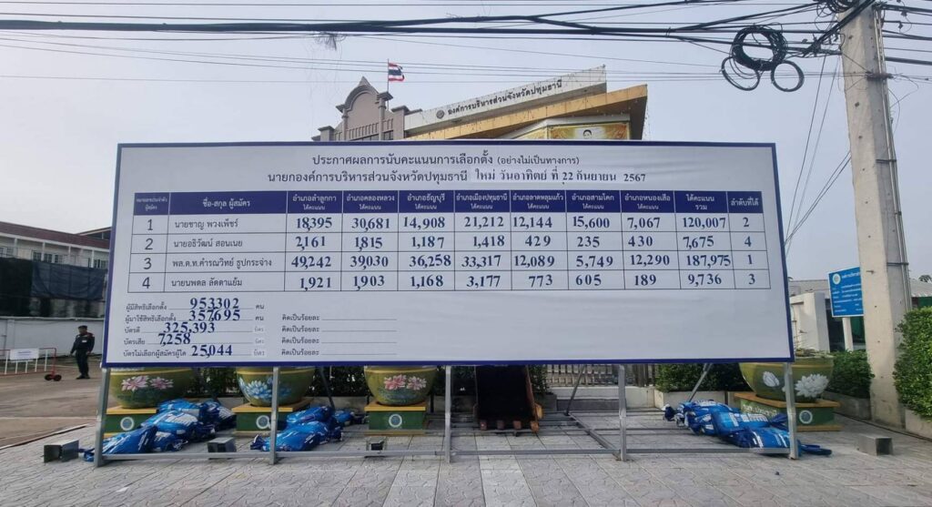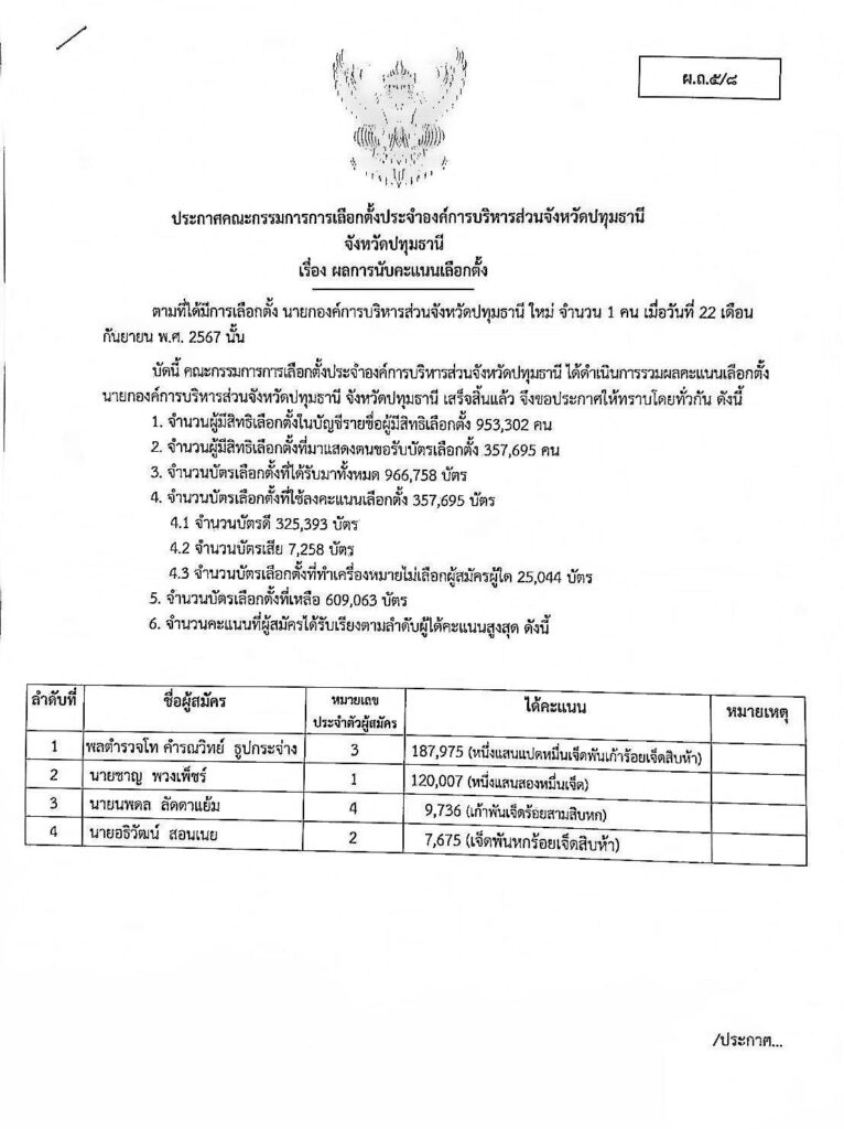 คณะกรรมการการเลือกตั้งประจำองค์การบริหารส่วนจังหวัดหวัดปทุมธานี ได้ออกประกาศ ผ.ถ.5/8 เรื่อง ผลการนับคะแนนเลือกตั้ง การเลือกตั้งนายกองค์การบริหารส่วนจังหวัดปทุมธานี เมื่อวันที่ 22 กันยายน 2567 , 1. จำนวนผู้มีสิทธิเลือกตั้งในบัญชีรายชื่อผู้มีสิทธิเลือกตั้ง 953,302 คน , 2. จำนวนผู้มีสิทธิเลือกตั้งที่มาแสดงตนขอรับบัตรเลือกตั้ง 357,695 คน , 3. จำนวนบัตรเลือกตั้งที่ได้รับมาทั้งหมด 966,758 บัตร , 4. จำนวนบัตรเลือกตั้งที่ใช้ลงคะแนนเลือกตั้ง 357,695 บัตร , จำนวนบัตรดี 325,393 บัตร , จำนวนบัตรเสีย 7,258 บัตร , จำนวนบัตรเลือกตั้งที่ทำเครื่องหมายไม่เลือกผู้สมัครผู้ใด 25,044 บัตร และ 5. จำนวนบัตรเลือกตั้งที่เหลือ 609,063 บัตร สำหรับผู้ได้คะแนนสูงสุด ลำดับที่ พลตำรวจโท คำรณวิทย์ ธูปกระจ่าง ได้คะแนน 187,975 (หนึ่งแสนแปดหมื่นเจ็ดพันเก้าร้อยเจ็ดสิบห้า) , นายชาญ พวงเพ็ชร์ ได้คะแนน 120,007 (หนึ่งแสนสองหมื่นเจ็ด) , นายนพดล ลัดดาแย้ม ได้คะแนน 9,736 (เก้าพันเจ็ดร้อยสามสิบหก) และ นายอธิวัฒน์ สอนเนย ได้คะแนน 7,675 (เจ็ดพันหกร้อยเจ็ดสิบห้า)