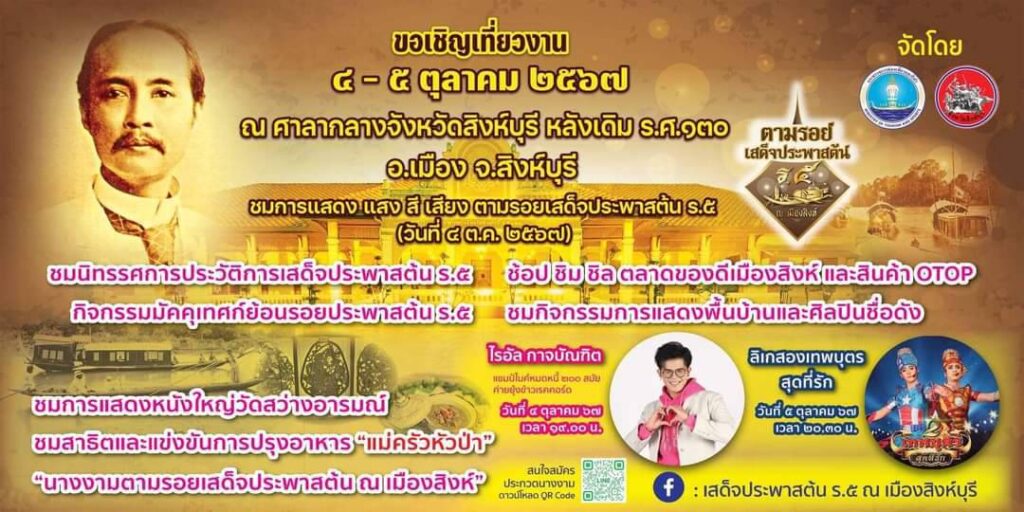 วันพฤหัสบดีที่ 26 กันยายน 2567 เวลา 17.00 น. ณ ห้องจัดเลี้ยงเกษรา ร้านเกษรา เบเกอรี่ อำเภอพรหมบุรี จังหวัดสิงห์บุรี โดยจังหวัดสิงห์บุรี ร่วมกับการท่องเที่ยวและกีฬาจังหวัดสิงห์บุรี ได้จัดงานเชิญเที่ยวงาน “ตามรอยเสด็จ ประพาสต้น รัชกาลที่ 5 ณ เมืองสิงห์ ระหว่างวันที่ 4-5 ตุลาคม 2567 เวลา 10.30 – 22.00 น. ณ ศาลากลางจังหวัดสิงห์บุรี (หลังเดิม) ร.ศ.130
