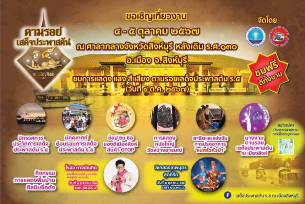 ศิลปินไรอัล แชมป์ 200 สมัย ไมค์หมดหนี้ การประกวดสาวงามตามเสด็จประพาสต้น ร.5 ณ เมืองสิงห์ และการแสดงดนตรีสดจากวงปลาตะเพียน - วันที่ 5 การสาธิตและการแข่งขันการทำอาหารแม่ครัวหัวป่า การแสดงหนังใหญ่จากวัดสว่างอารมณ์ การแสดงศิลปพื้นบ้านลิเกคณะสองเทพบุตรสุดที่รัก นอกจากนี้ภายในงานยังได้พบกับการท่องเที่ยวตามรอยเสด็จประพาสต้น ร.5 ด้วยรถราง พร้อมมัคคุเทศก์ที่จะให้ความรู้สาระดีๆ ตลอดเส้นทางตามเสด็จฯ ชม ช้อป ชิม กับสินค้าโอทอปและสินค้าของดีจังหวัดสิงห์บุรี ที่พร้อมจำหน่ายทุกวัน