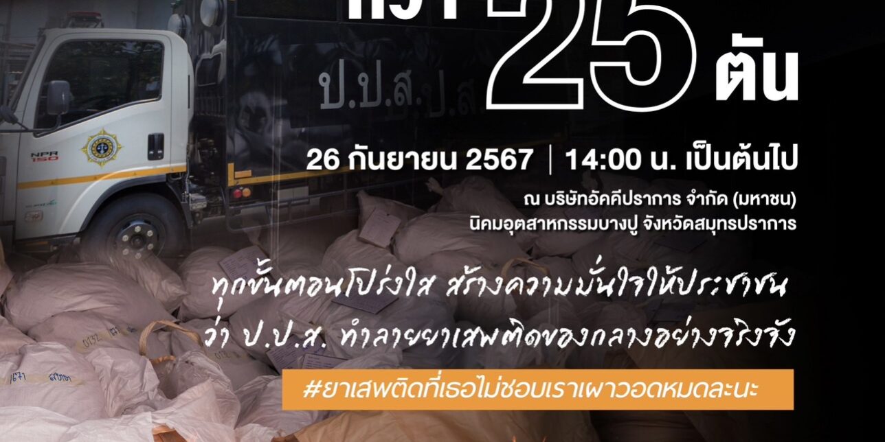 วันพฤหัสบดีที่ 26 กันยายน 2567 พ.ต.อ.ทวี สอดส่อง รัฐมนตรีว่าการกระทรวงยุติธรรม เป็นประธานในพิธีการทำลายยาเสพติดของกลางของสำนักงาน ป.ป.ส. พร้อมด้วย นายสมคิด เชื้อคง ทีมงานนายกรัฐมนตรี พล.ต.ท.ภาณุรัตน์ หลักบุญ เลขาธิการ ป.ป.ส. นายอภิกิต ฉ.โรจน์ประเสริฐ รองเลขาธิการ ป.ป.ส. นายธาตรี เล็กสุวรรณ ผู้ช่วยผู้อำนวยการการนิคมอุตสาหกรรมแห่งประเทศไทย ตัวแทนจากภาคประชาชน นักร้องนักแสดงผู้มีชื่อเสียง ได้แก่ นายยุทธนา เปื้องกลาง (ตูมตาม เดอะสตาร์) นางสาวรุ่งรัตน์ เหม็งพานิช (ไข่มุก เดอะวอยซ์) และนางสาวพัสกร พลบูรณ์ (ใบเฟิร์น) เข้าร่วมเป็นสักขีพยานพิธีการทำลายยาเสพติดของกลาง ณ บริษัท อัคคีปราการ จำกัด (มหาชน) นิคมอุตสาหกรรมบางปู จังหวัดสมุทรปราการ